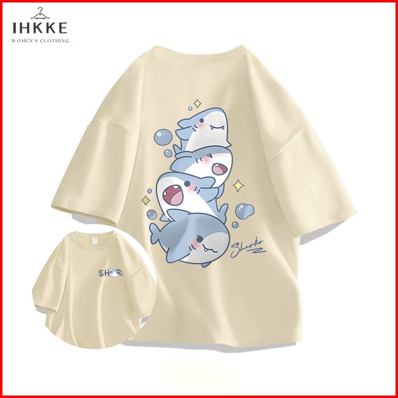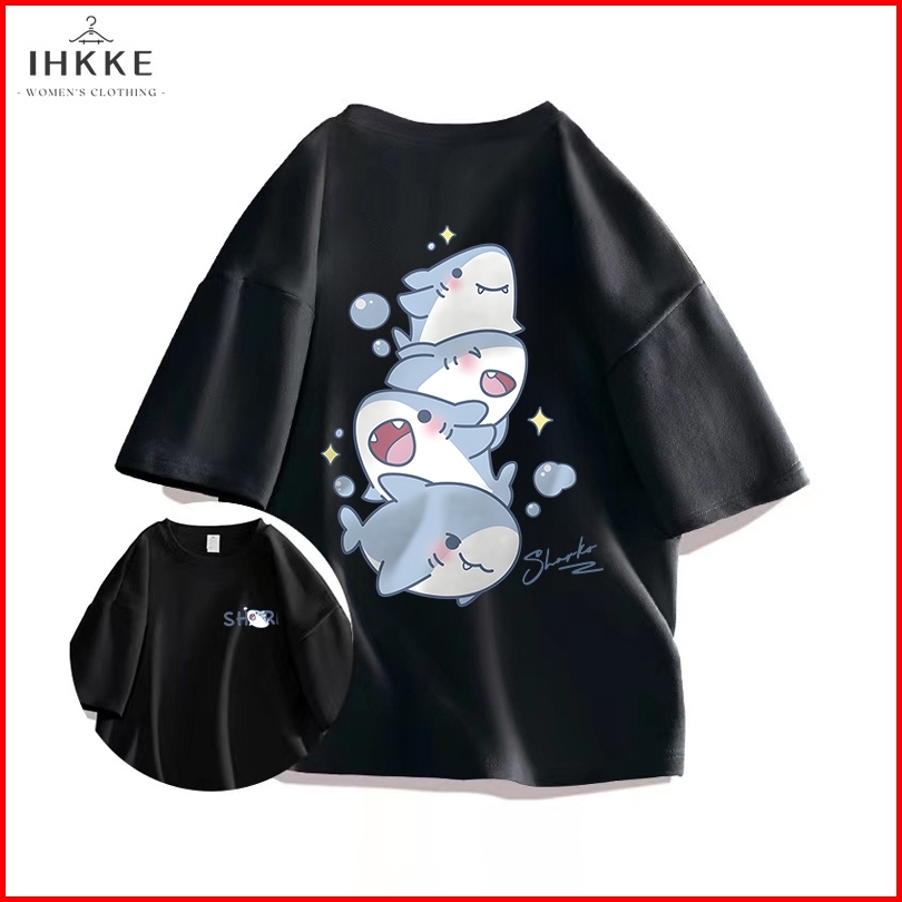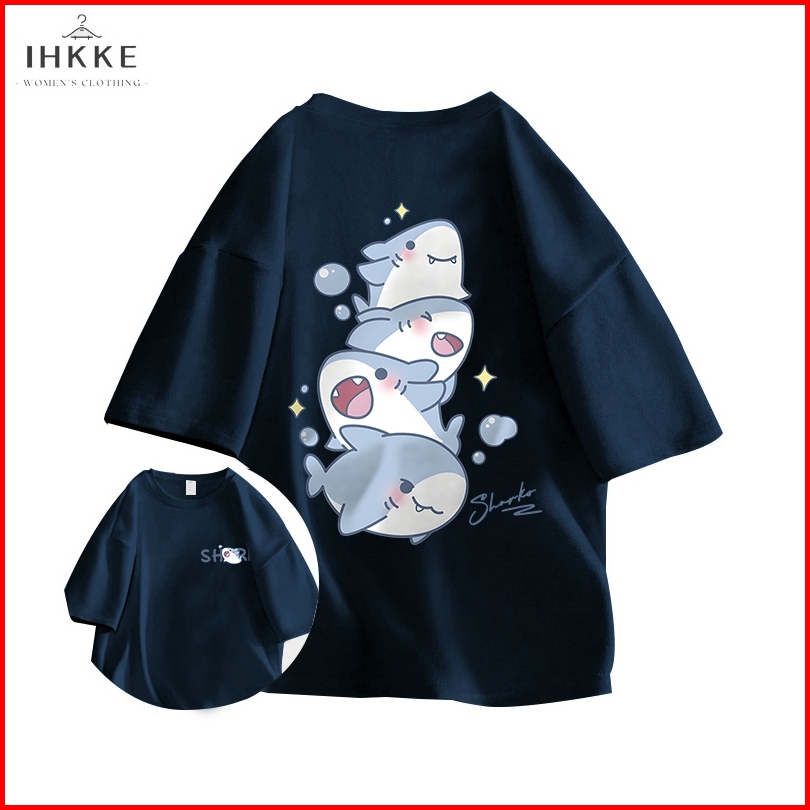 Ihkke Kaos Wanita Korean Style Lengan Pendek Cartoon Cute Shark Graffiti Pattern Kaos Biru Import Atasan Kekinian Wanita