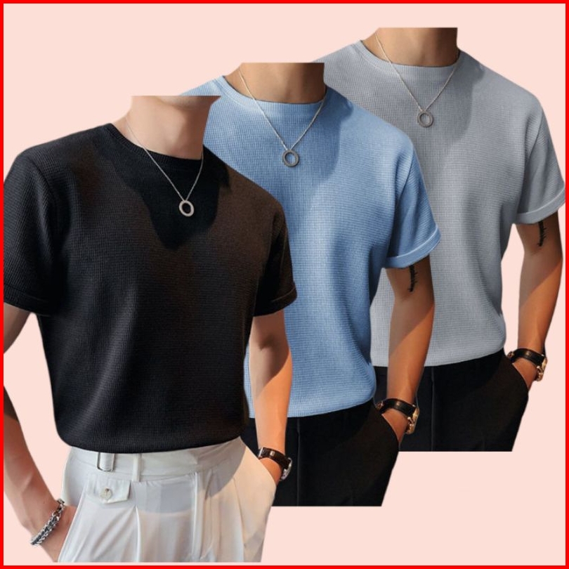 Paket 3 Pcs Kaos Knit Wafer Motif Kotak Timbul Pria Dewasa