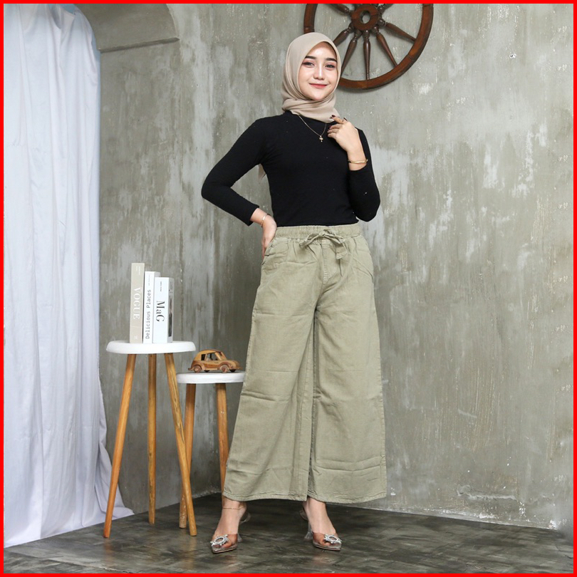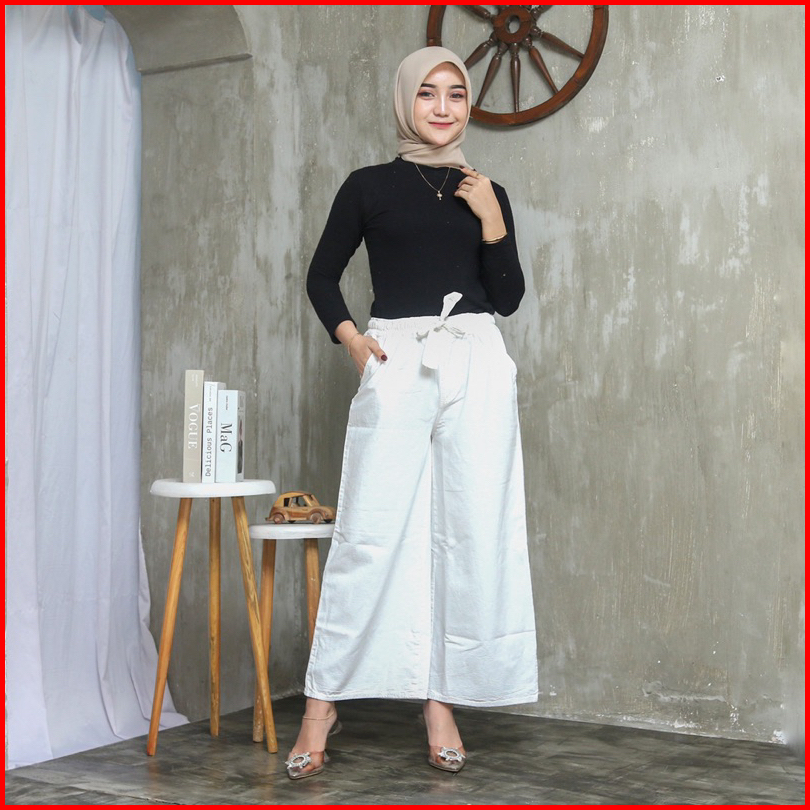 Celana Jeans Warna Putih Sage Coklat Cream Pinggang Full Karet Kulot Jeans Jumbo Kekinian