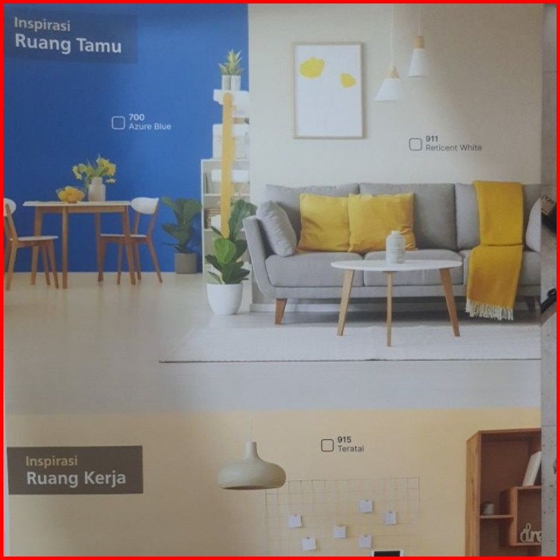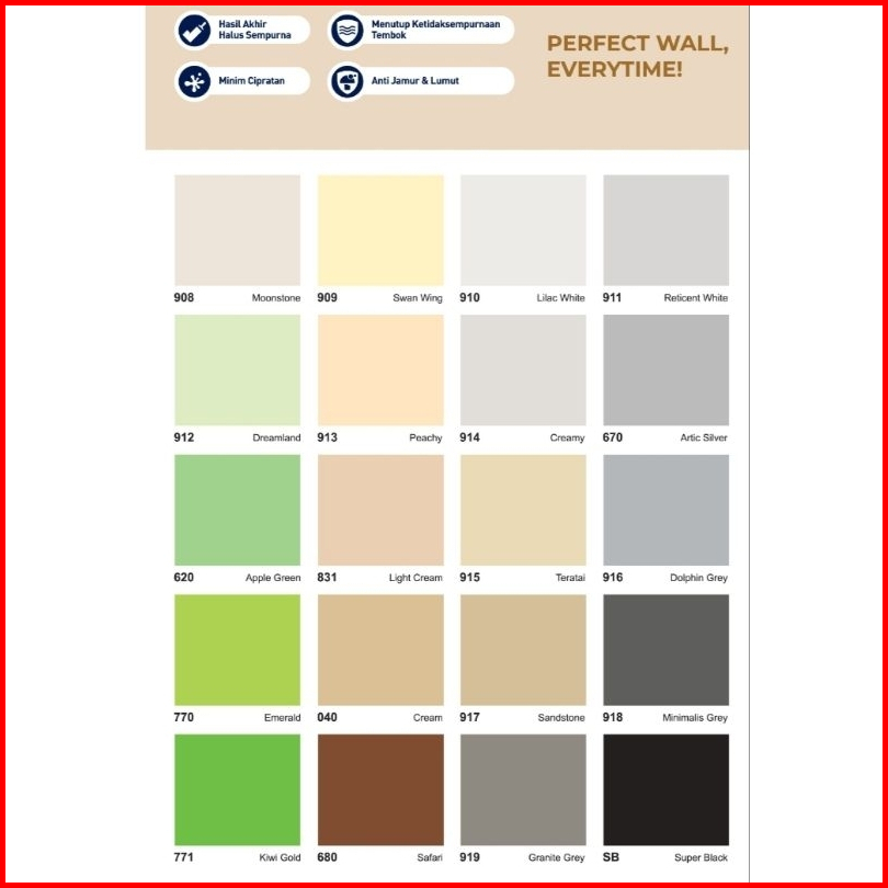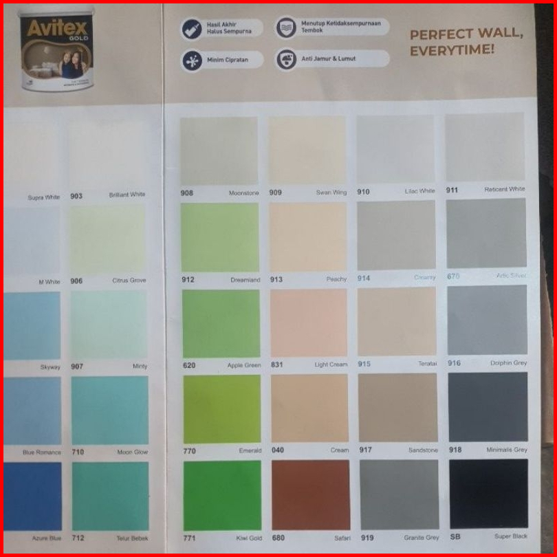 901 MARIGOLD, 902 SUPRA WHITE, 752 CHAMPAGNE, 905 M WHITE, 755 GOLDEN YELLOW, 602 SKYWAY, 765 SUN FLOWER, 601 BLUE ROMANCE, 745 FIESTA, 700 AZURE BLUE, 908 MOONSTONE, 910 LILAC WHITE, 912 DREAMLAND, 914 CREAMY, 620 APPLE GREEN, 915 TERATAI, 770 EMERALD, 917 SANDSTONE, 771 KIWI GOLD, 919 GRANITE GREY, PUTIH BASE A, 736 RED CHILI, PUTIH BASE B, SB SUPER BLACK, 680 SAFARI, 918 MINIMALIS GREY, 040 CREAM, 916 DOLPHIN GREY, 831 LIGHT CREAM, 670 ARTIC SILVER, 913 PEACHY, 911 RETICENT WHITE, 909 SWAN WING, 712 TELUR BEBEK, 735 BRIGHT RED, 710 MOON GLOW, 725 CHERY PINK, 907 MINTY, 720 CANDY PINK, 906 CITRUS GROVE, 904 PINGKY, 903 BRILLIANT WHITE, SW SUPER WHITE