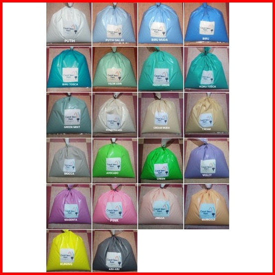 PUTIH, PUTIH SALJU, BIRU MUDA, BIRU, TELOR ASIN, FRESH GREEN, BIRU TOSCA, HIJAU TOSCA, GREEN MINT, PUTIH TULANG, CREAM MUDA, CREAM, MOCCA, GREEN, AVOCADO, VIOLET, MAGENTA, PINK, JINGGA, MARIGOLD, KUNING, ABU-ABU, KUNING LEMON, HIJAU MUDA, BANANA, ABU MUDA, SOFT MINT