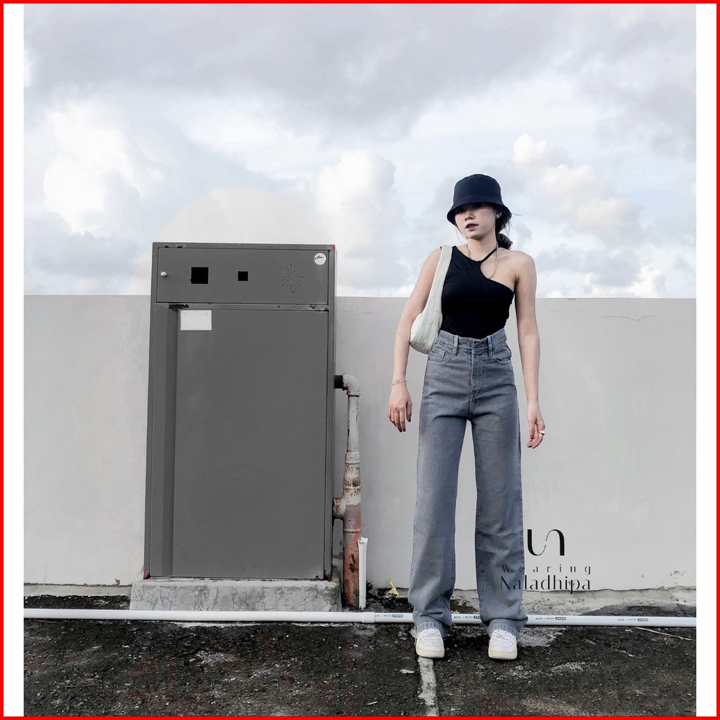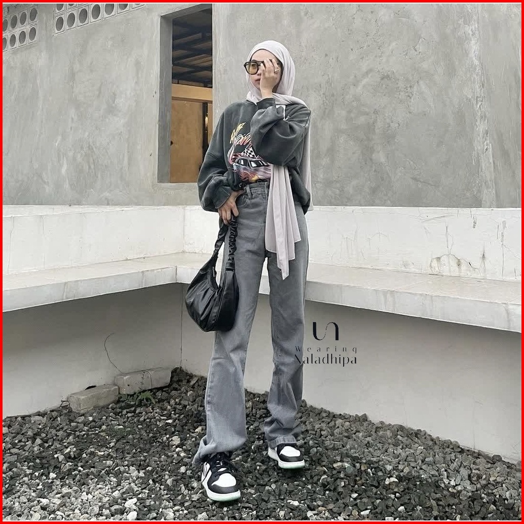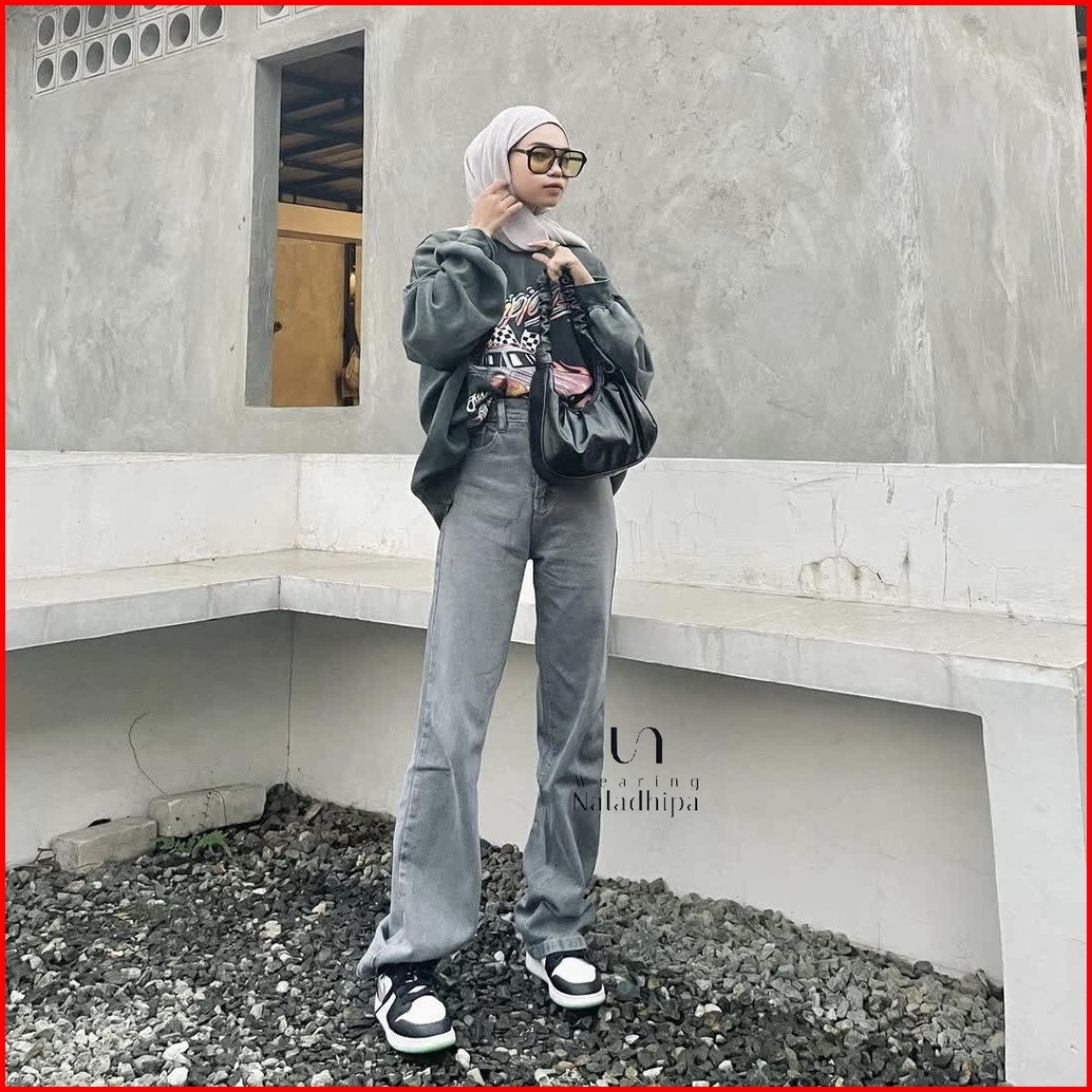 Naladhipa - Nara Pants Grey Highwaist Stright Jeans Denim Loose Jeans Celana Wanita Celana Jeans Wanita High Waist Jeans