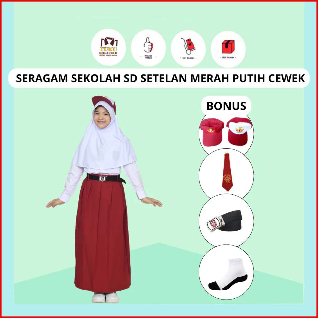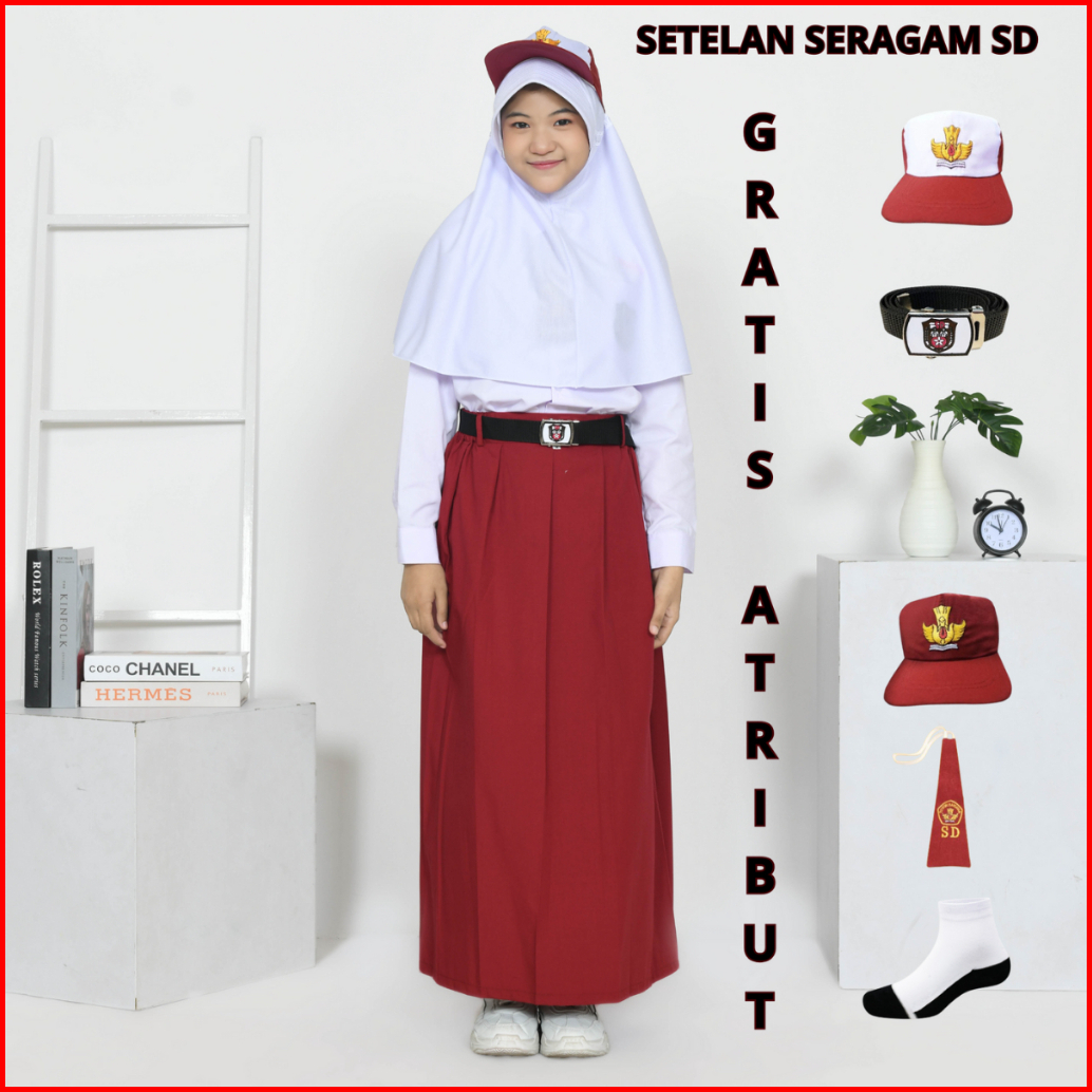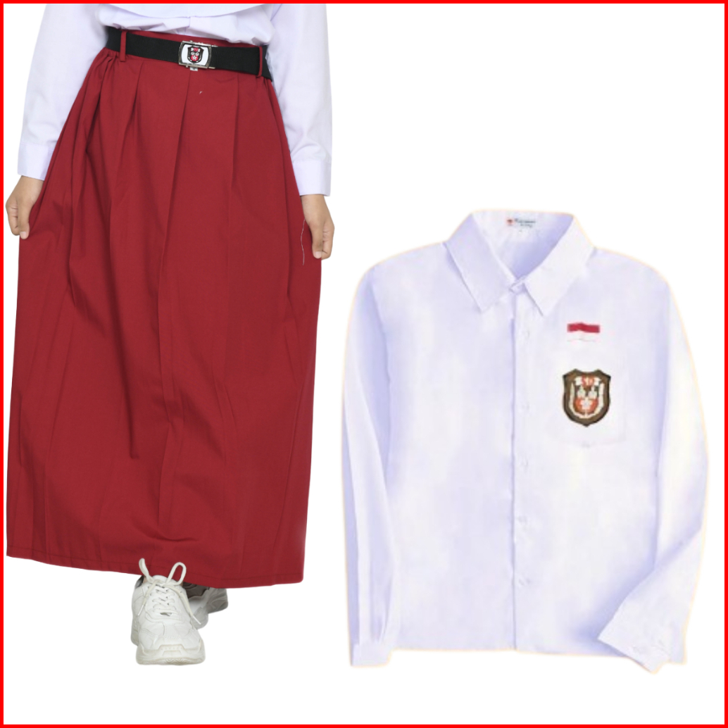 Baju Sekolah Lengan Panjang Setelan Super Premium Rok Merah Seragam Kelas Sd Perempuan Lengkap