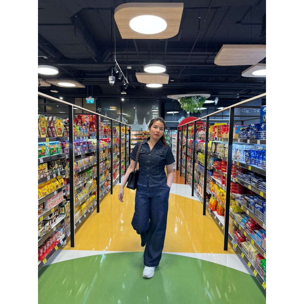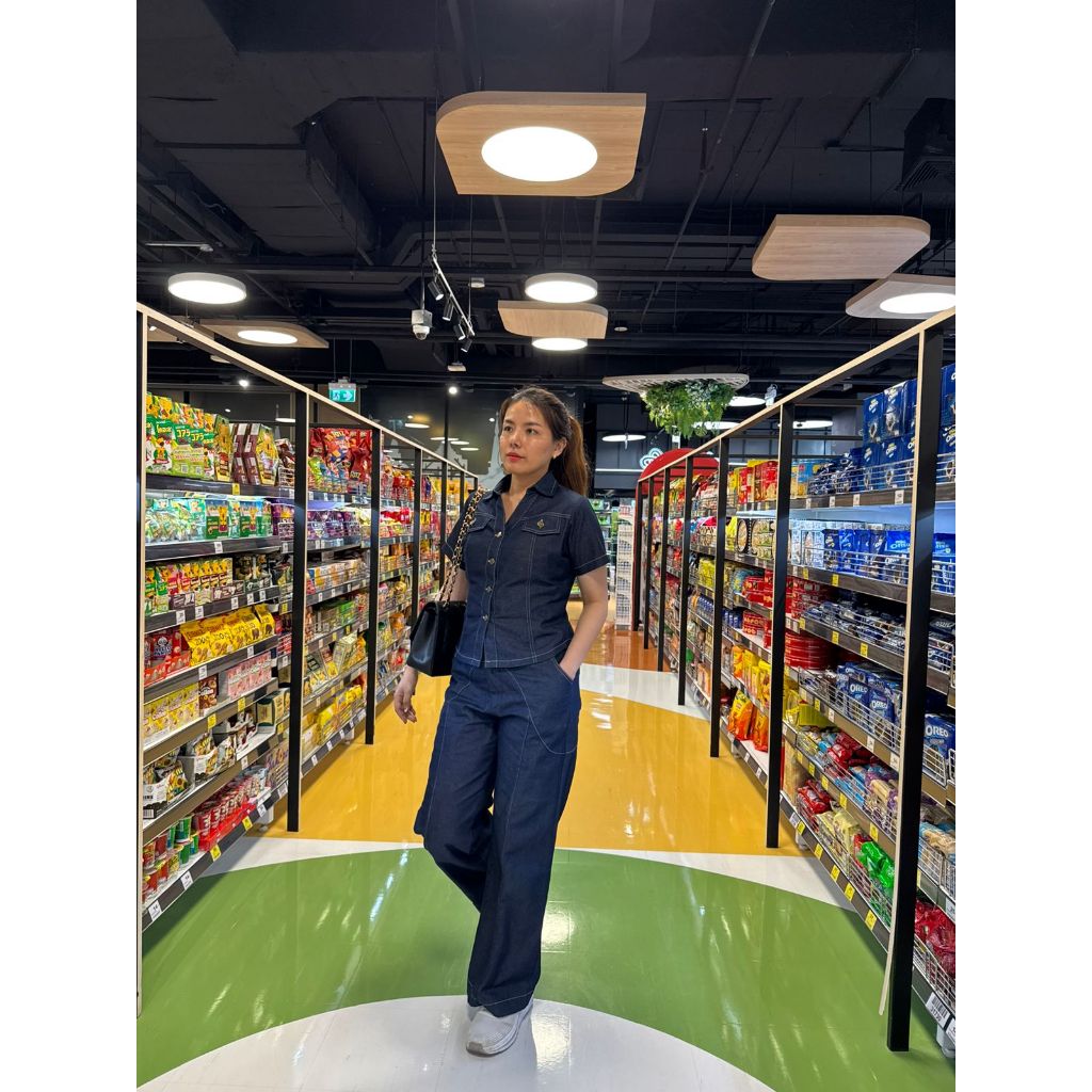 Domscorner - JaeA set denim - kulot hiwhwaist - bustier style top - collar buttoned blouse - baju jeans premium kekinian wanita