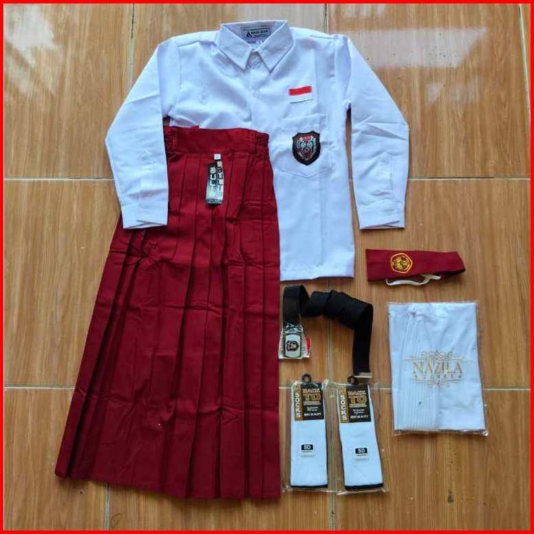 Seragam Merah Putih Sd Panjang Setelan Anak Perempuan Usia 7-12 Tahun Bonus Jilbab Putih Perempuan