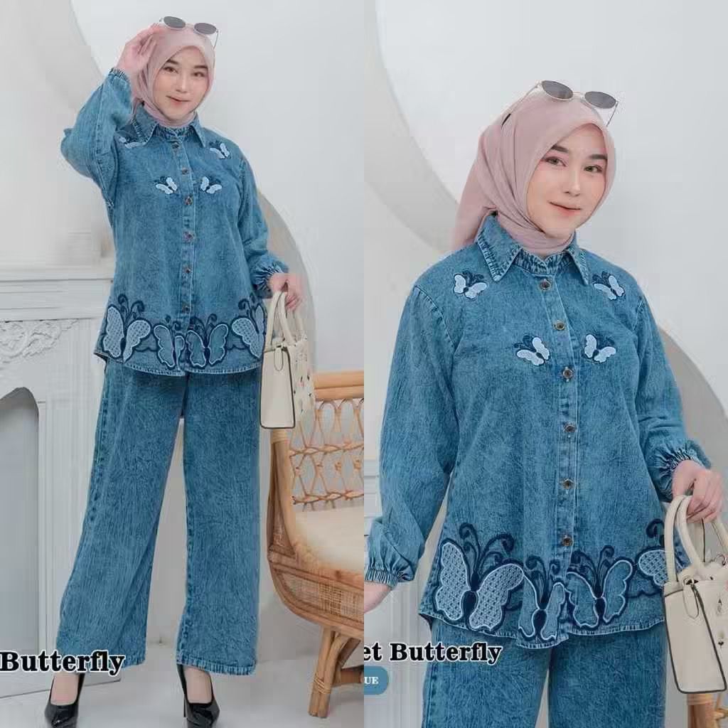 Setelan Celana BUTTERFLY JeansWash Premium Import Terbaru Set Denim Bordir Kupu-Kupu Wanita 2025 Bisa Edition Jeans Setcel Terlaris