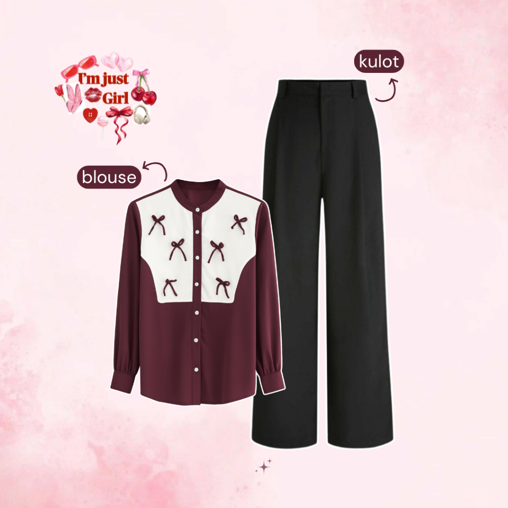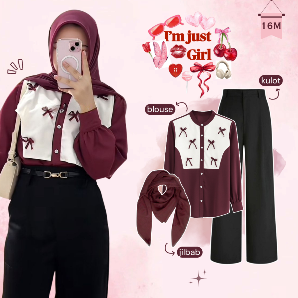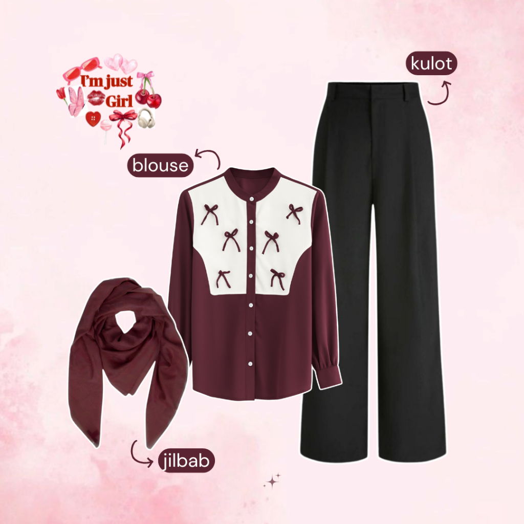 3in1 - One Set Wanita Hijab Bella Square & Blouse Kombinasi Rompi Pita & Celana Kulot Knit Hitam 16M