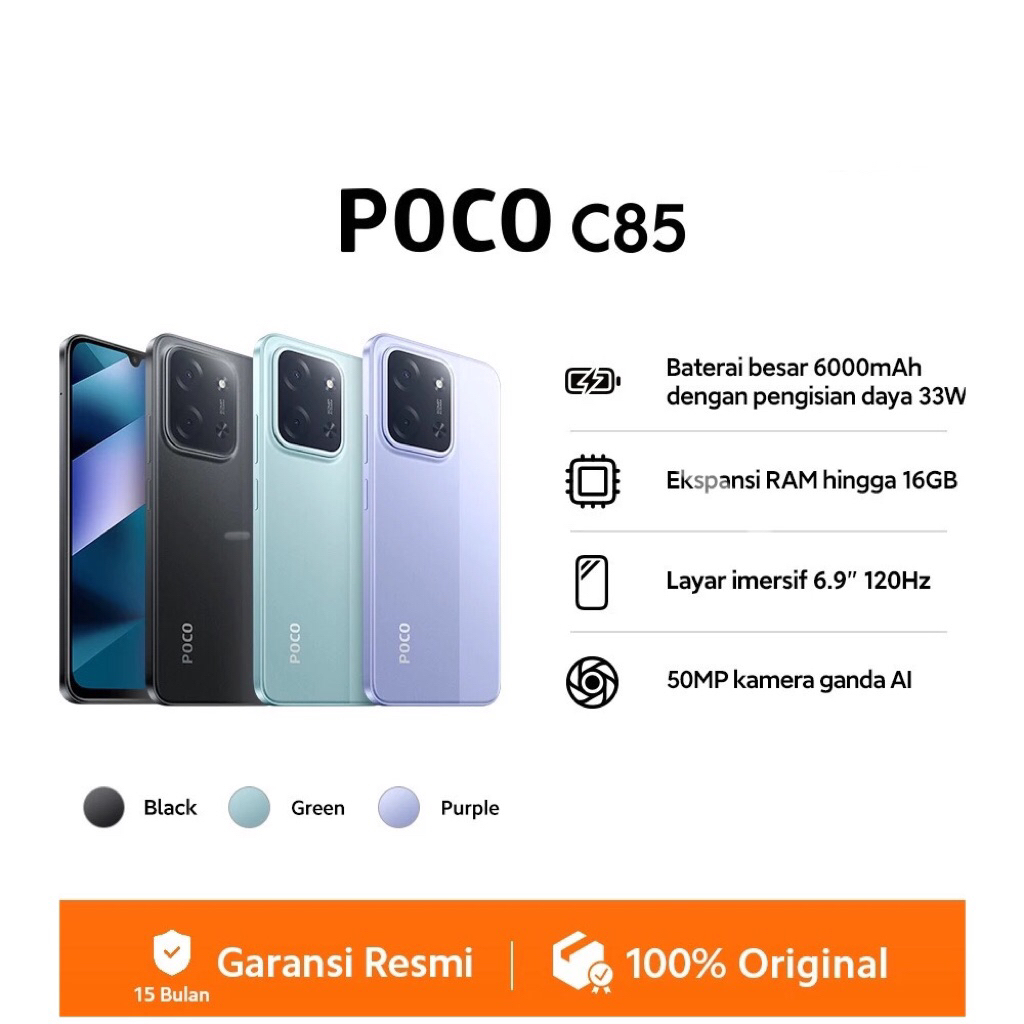 Poco C85 6/128GB - 8/256GB Extended RAM hingga 16GB - Helio G81 Ultra - 50MP Dual Camera AI - Layar imersif 6.9" 120Hz -Li-Po 6000mAh