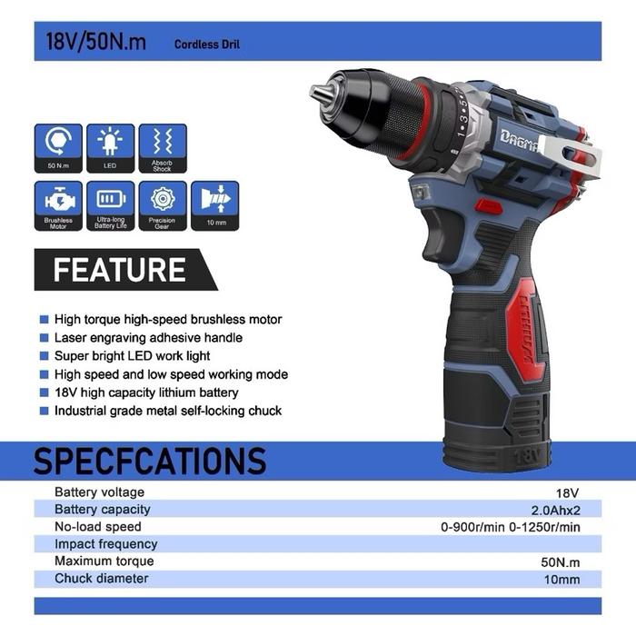 DAGMARA KEN SERIES V18 BRUSHLESS CORDLESS DRILL RECHARGEABLE SCREWDRIVER HAND DRILL POWER TOOLS - 21V
