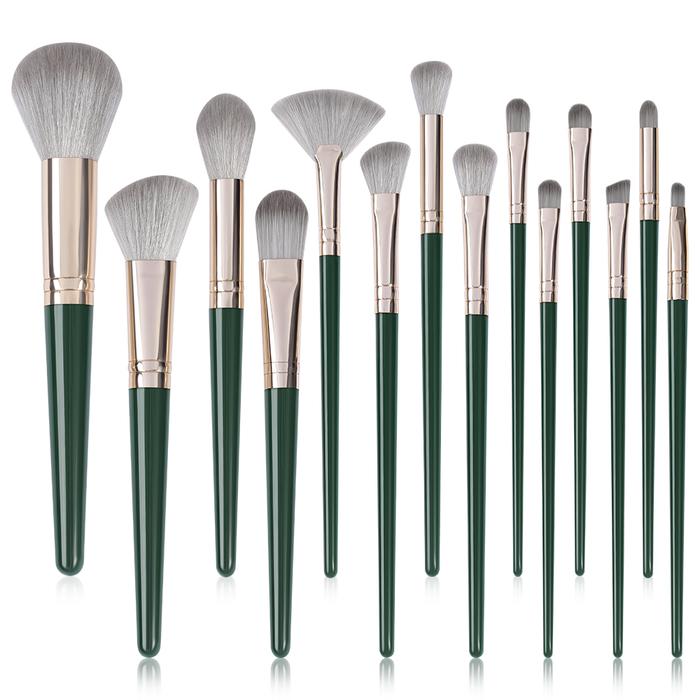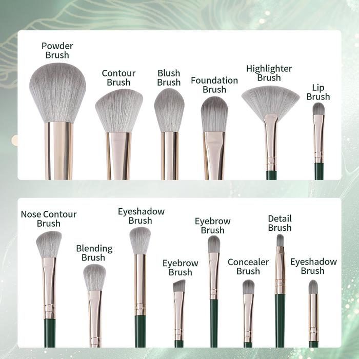 14 PCS SET KUAS MAKEUP PROFESIONAL | BULU LEMBUT & HALUS | GAGANG KAYU & TAS PU | MUDAH DIBERSIHKAN – WARNA HIJAU ELEGAN 1340 - BRUSH 14 PCS