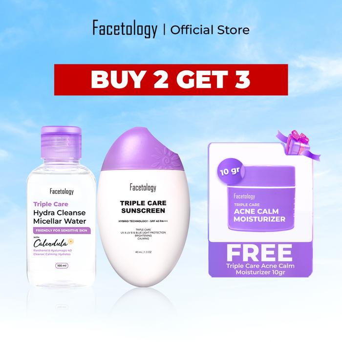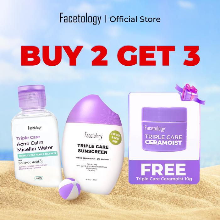 [BEST DEAL] FACETOLOGY TRIPLE CARE MICELLAR WATER 100 ML + TRIPLE CARE SUNSCREEN SPF 40 PA+++ 40ML - PERAWATAN, MEMBERSIHKAN WAJAH - ACNE & OILY + MWA 100
