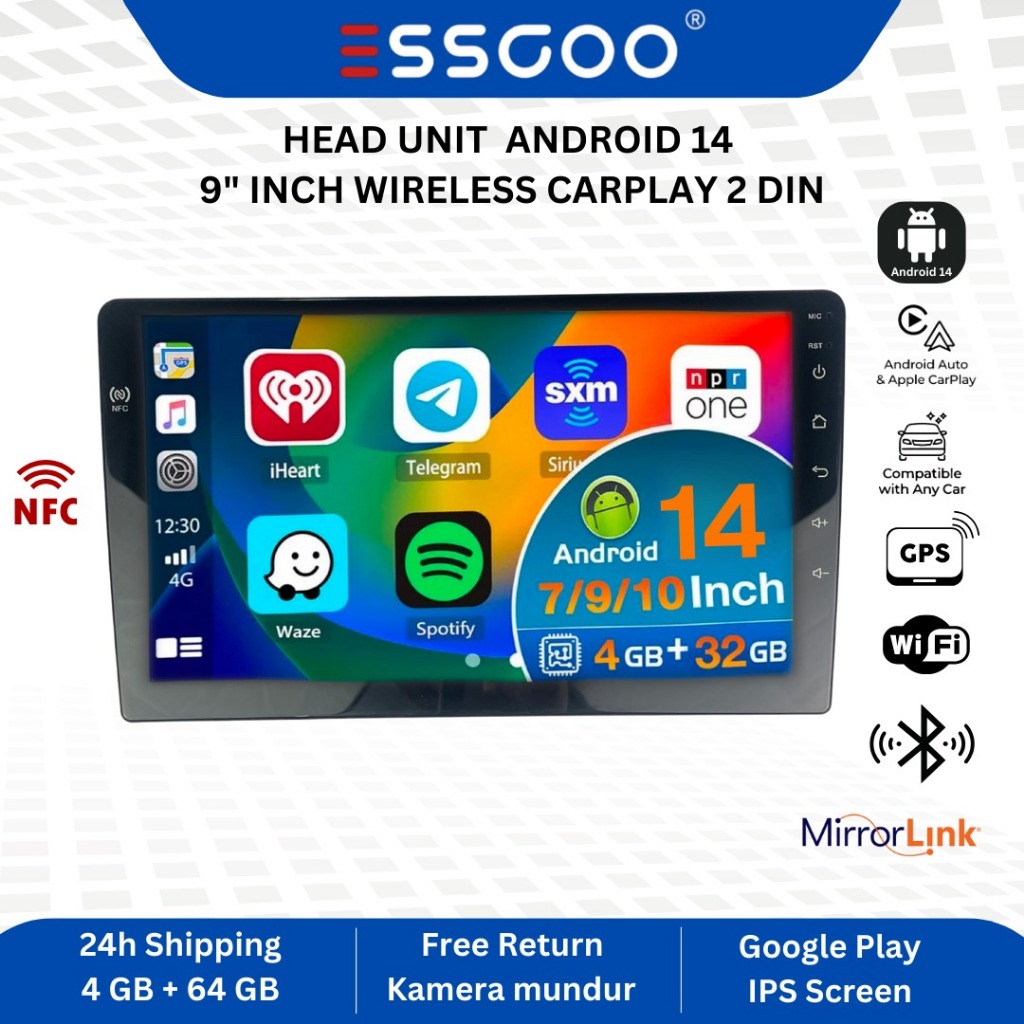 ESSGOO Head Unit Android14 NFC 9 Inch 2 Din 4+64GB Touch Screen Carplay&Android Auto Car Navigation
