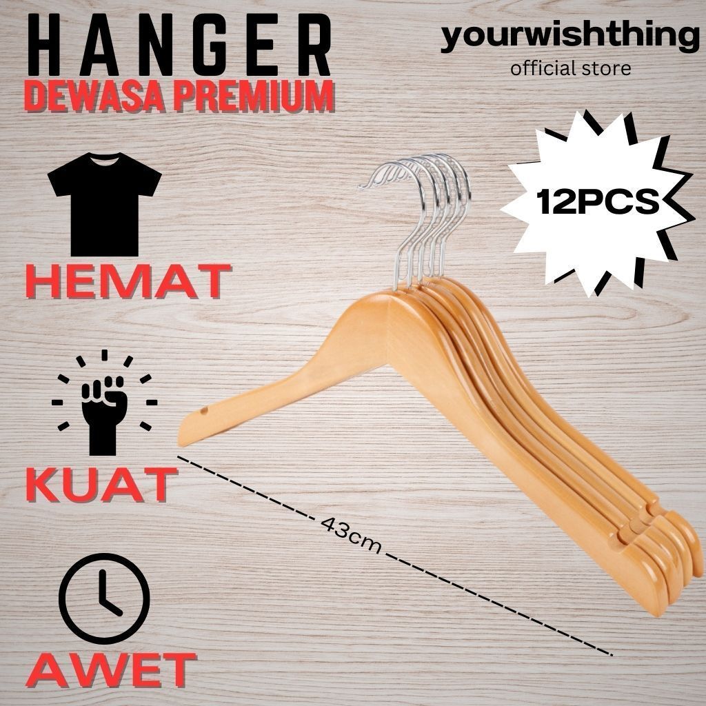 Hanger Kayu Dewasa 1 Lusin / Hanger Kayu Tanpa Palang Warna Natural Grade A
