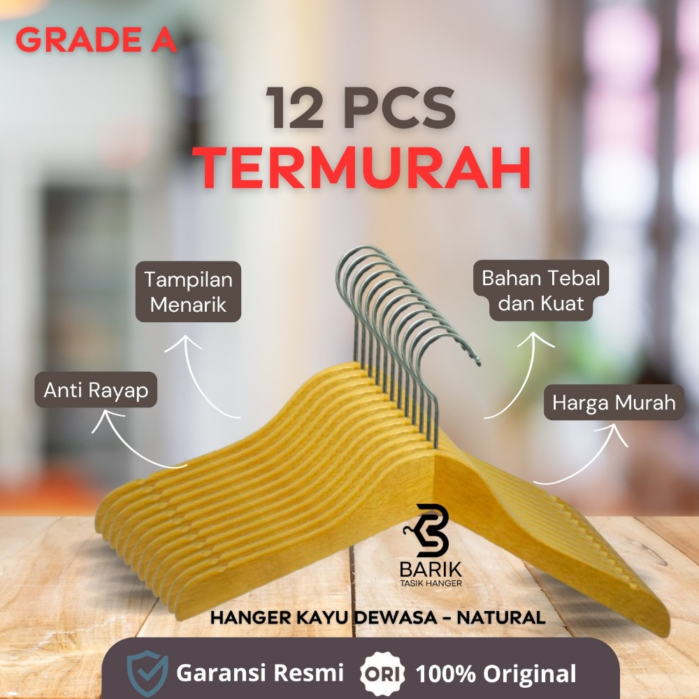 [12Pcs ] Hanger Gantungan Baju Dewasa Natural Bahan Kayu Tebal Dan Kuat Aesthetic Premium