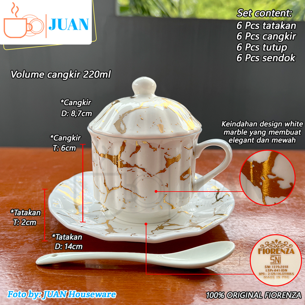 FIORENZA 6 pasang cangkir set + sendok + tutup series duluxe white marble 220ml / tea set coffee cup and saucer ceramic