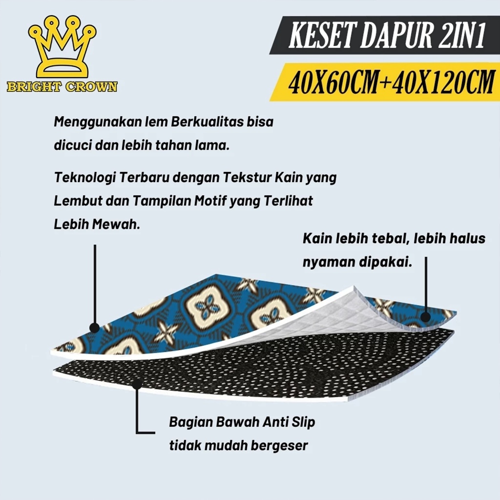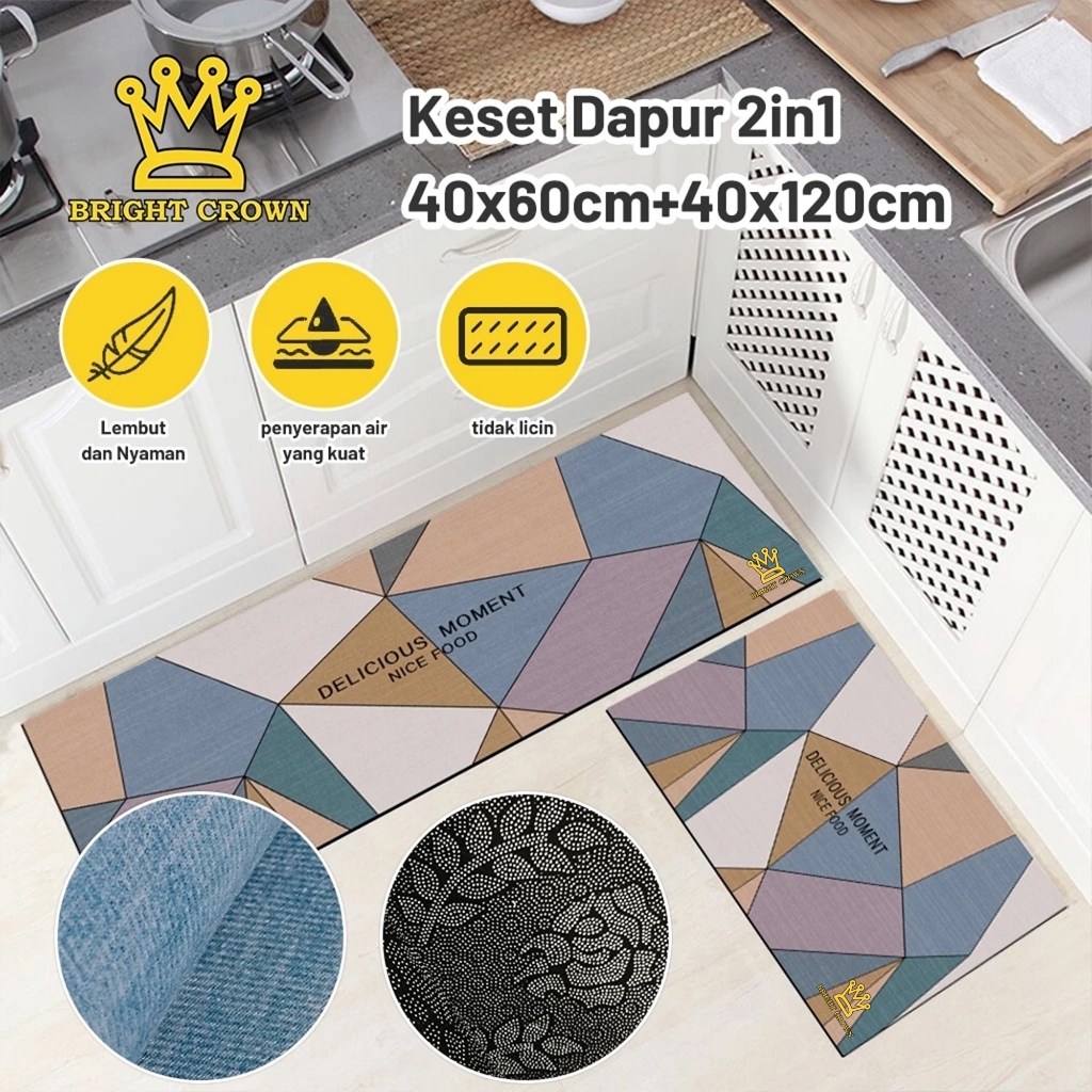 Bright Crown X Happyfamily 2In1 Keset Kaki Dapur Motif Anti Slip Uk 40X60 &40X120 Overlock Halus