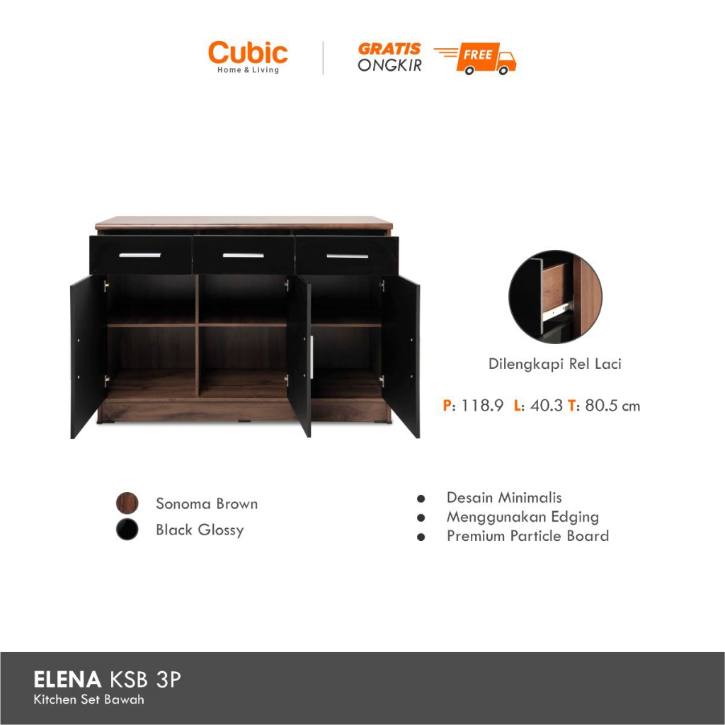 Cubic Kitchen Set 3 Pintu Minimalis / Rak Bawah Dapur / Elena Ave Ksb 3P - Putih / Hitam