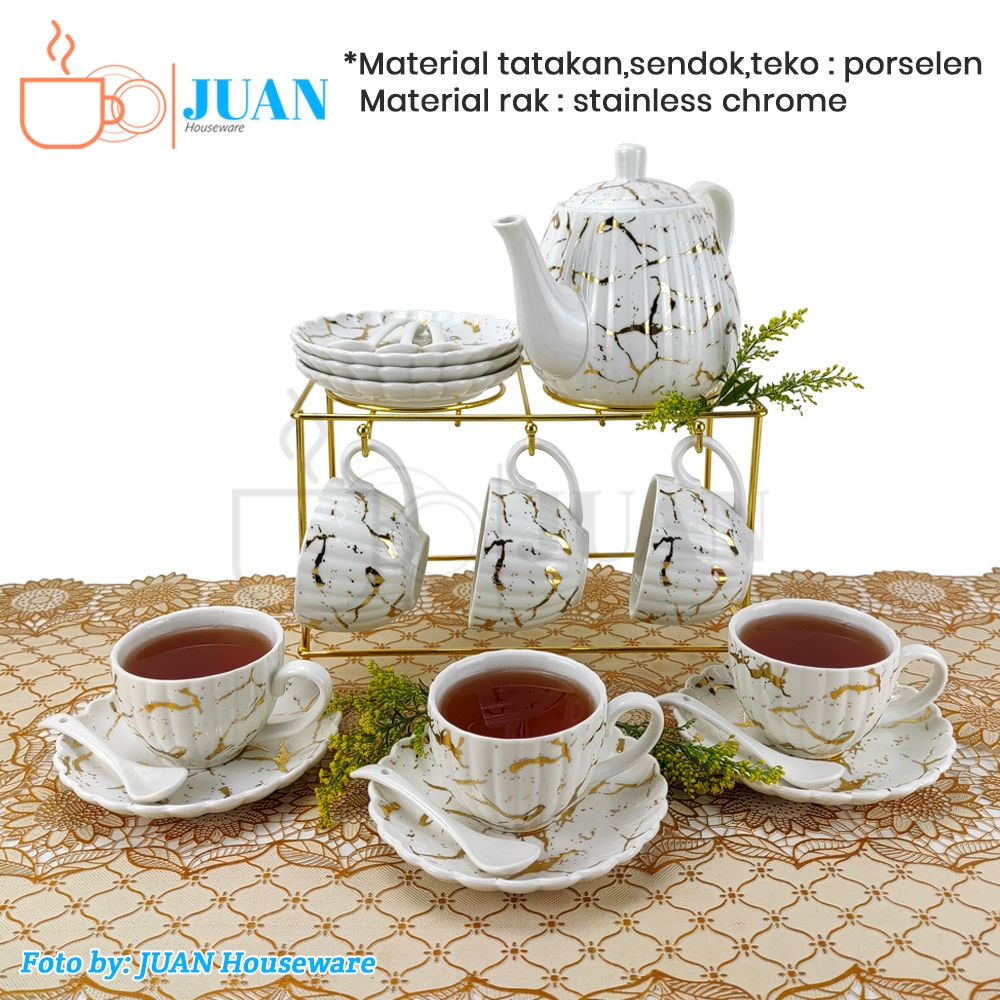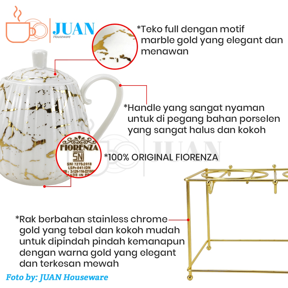 FIORENZA Tea set keramik motif deluxe white marble + rak gold stainless / teko + cangkir + tatakan motif marble porcelai