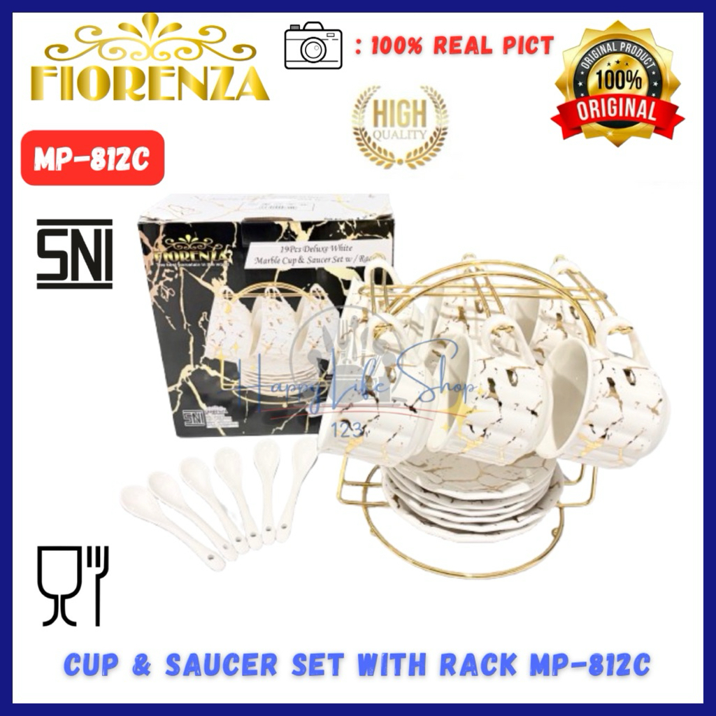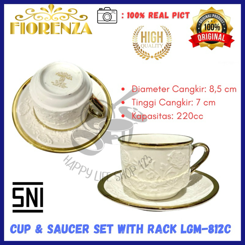 Cup & Saucer With Rack 12 pcs Linning Gold Motif / Cangkir Set 12pcs + Tatakan + Sendok + Rak / Cangkir Set + Rak FIOREN