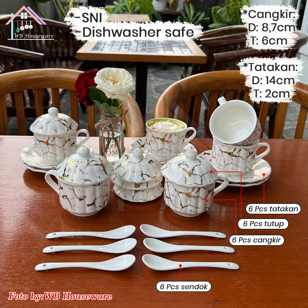 FIORENZA 6 pasang cangkir set + sendok + tutup series duluxe white marble 220ml / tea set coffee cup and saucer ceramic