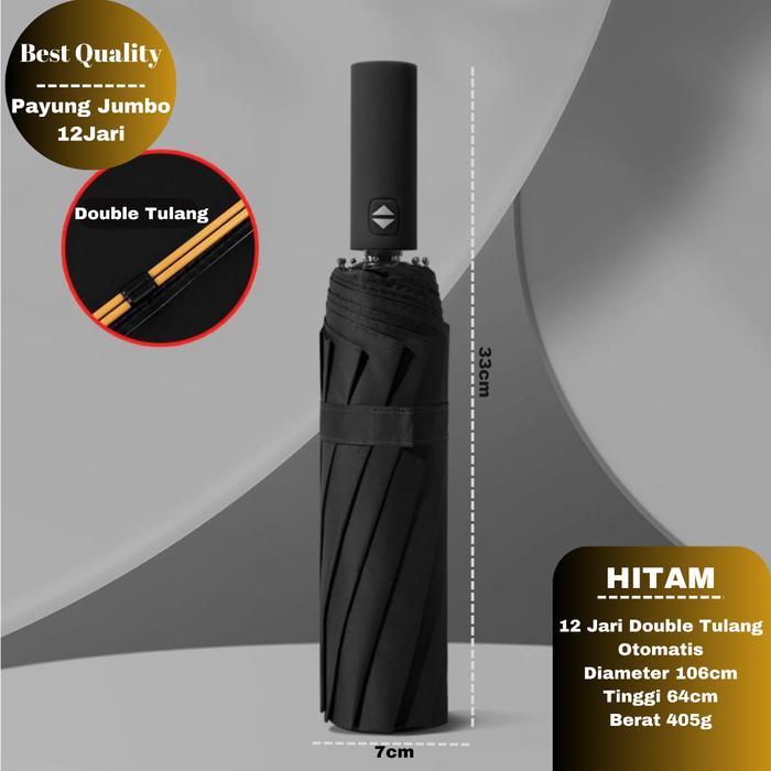 Payung Hujan/Matahari Premium Lipat Otomatis 12 Jari Anti UV - Hitam 12-Jari