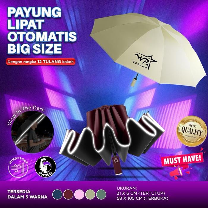 Payung Lipat Otomatis 12 Tulang Premium Anti UV & Waterproof Pink Stainless - Pink