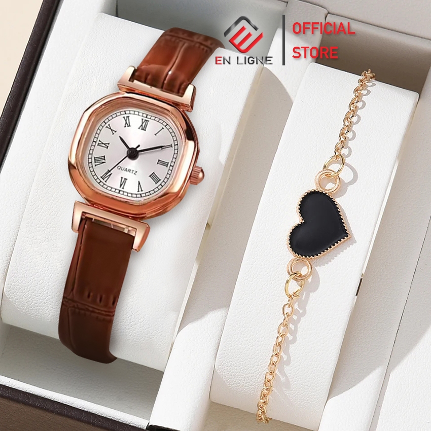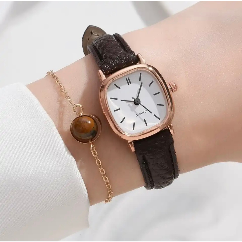 ENLIGNE - EL915 - Jam Tangan Fashion Wanita Kotak Kecil Tali Kulit - Set Gelang Bonus Box Cantik