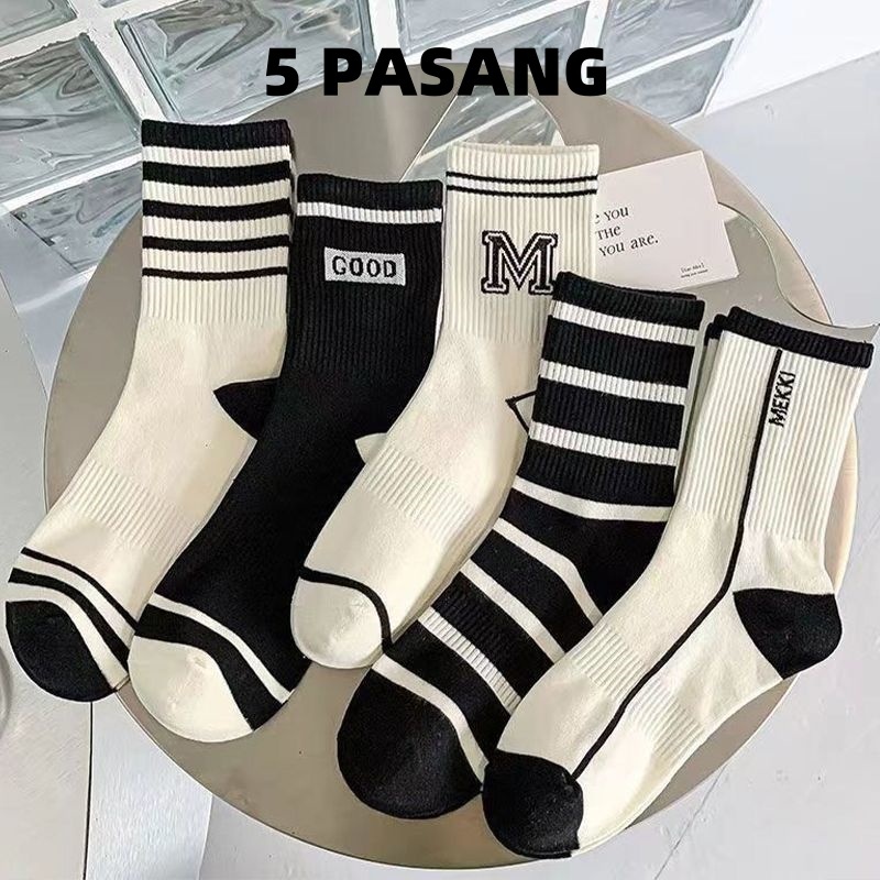 Kaos kaki panjang Letter R strip garis hitam putih kaos kaki panjang korean style diatas mata kaki kaos kaki mid socks