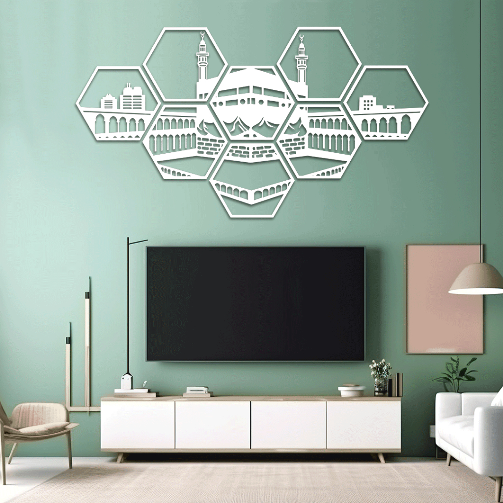 Pajangan dinding kayu dekorasi ruangan minimalis Motif Ka'bah kaligrafi islami Hiasan rumah aesthetic hexagon 1set isi 8