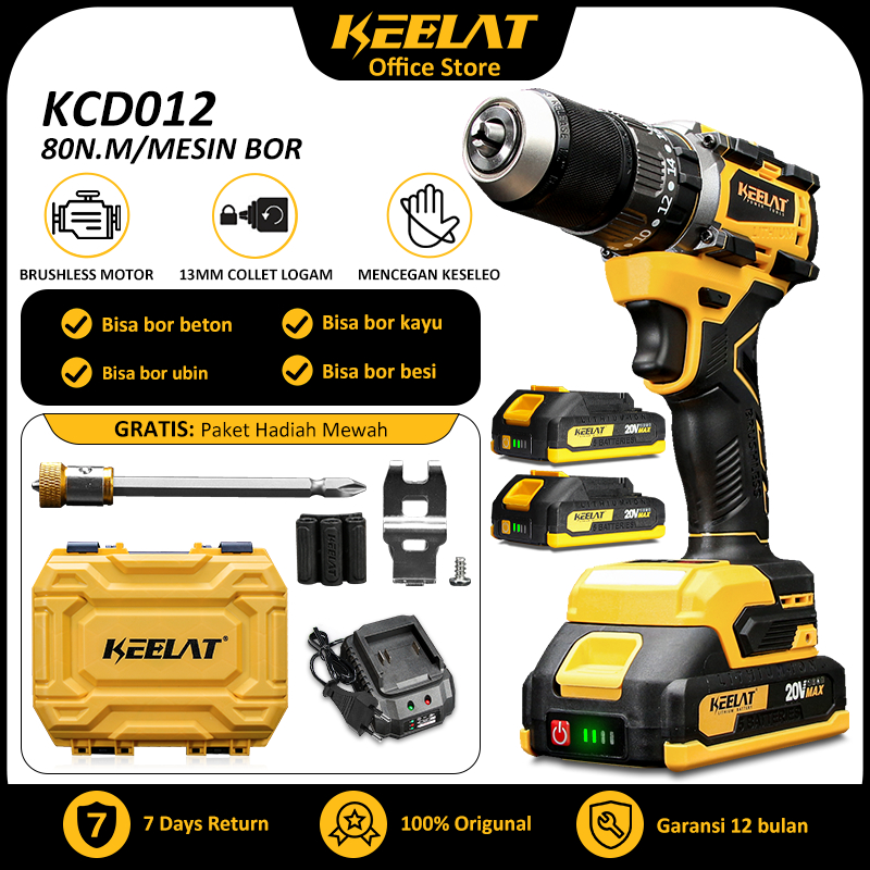 [KEELAT-KCD012]20V Brushless Mesin Bor Heavy -Duty Drill 80nm Cordless Drill Bor 13mm Bor Listrik 1.5A MT Baterai