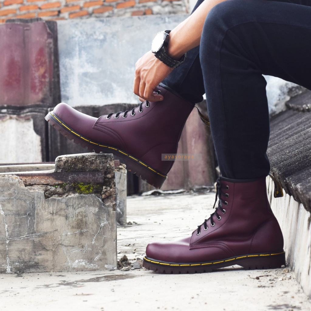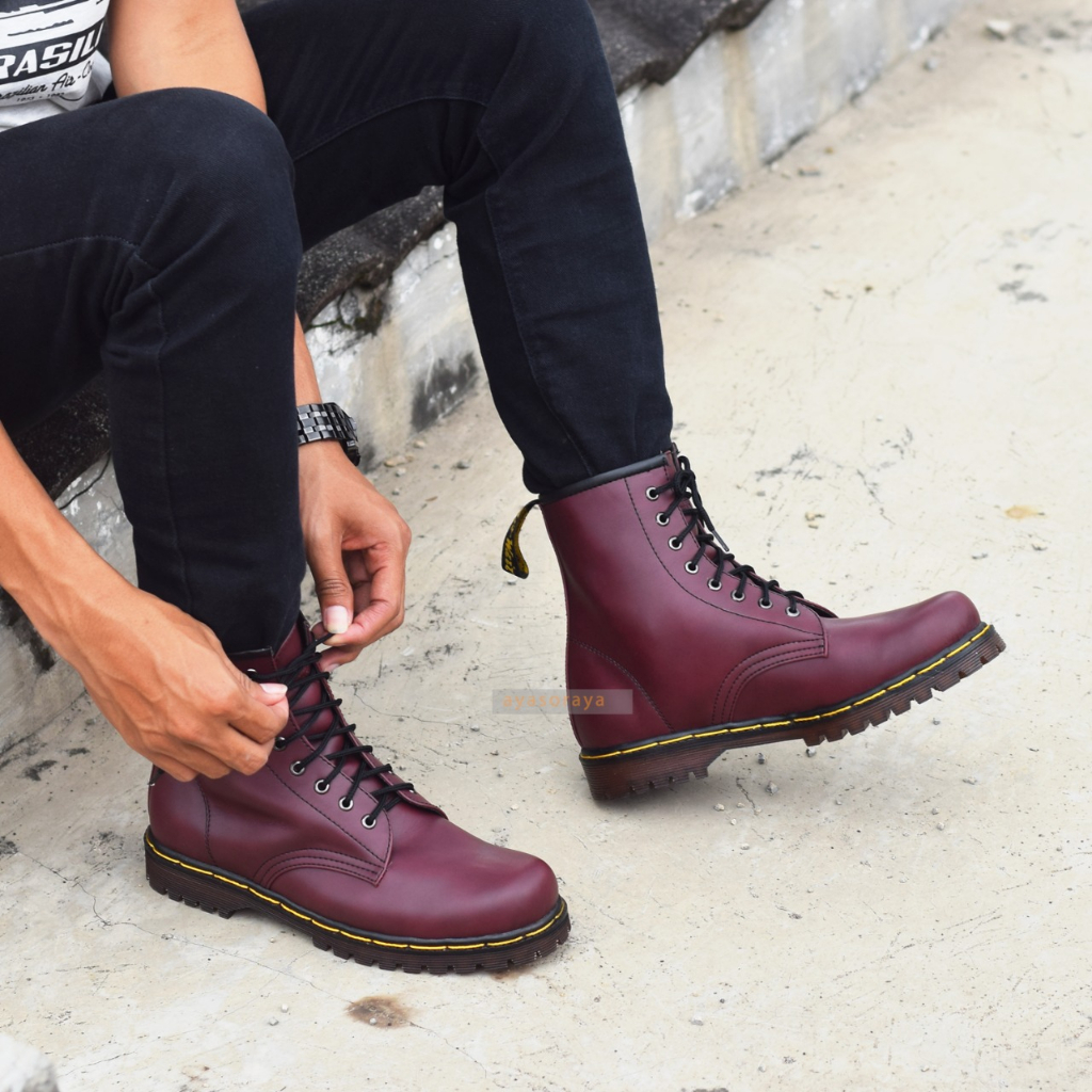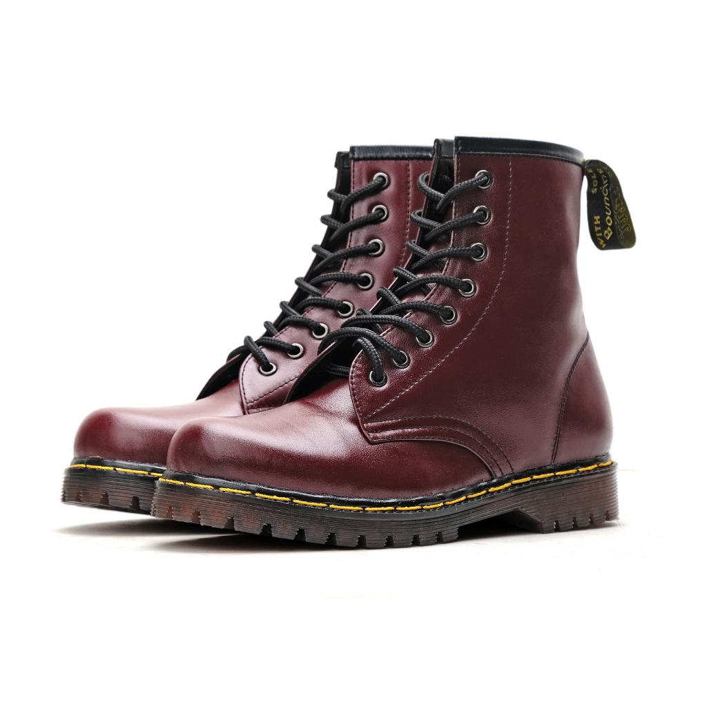 Sepatu Boots Model Dr Martens 8 Lubang Hole Warna Merah Maroon Marun Kulit Sapi Asli Uk Besar 36-45