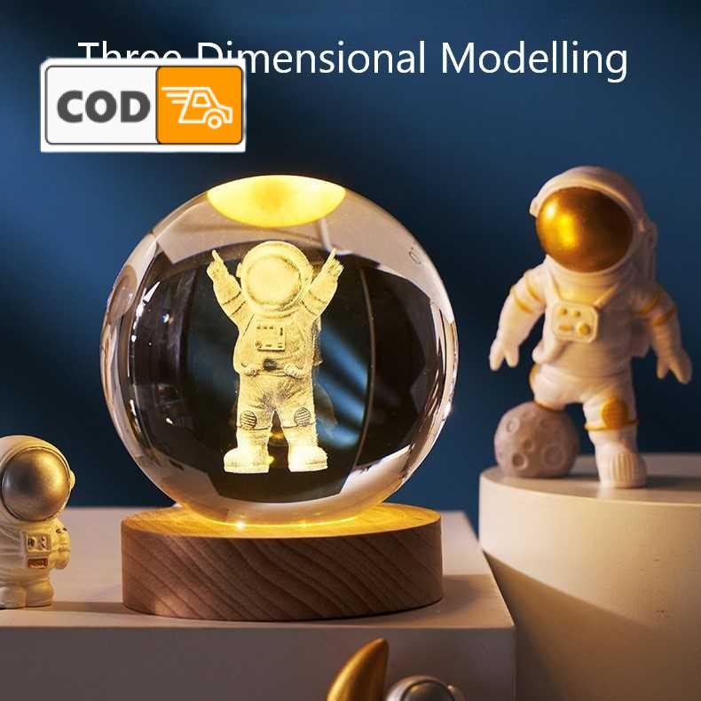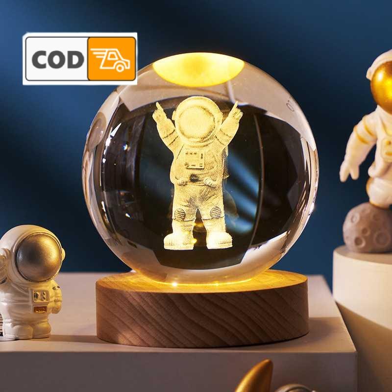 Lampu Tidur Bola Kristal 3D LED USB Dekorasi Meja Dudukan Kayu Warm White Unik Astronot Solar System