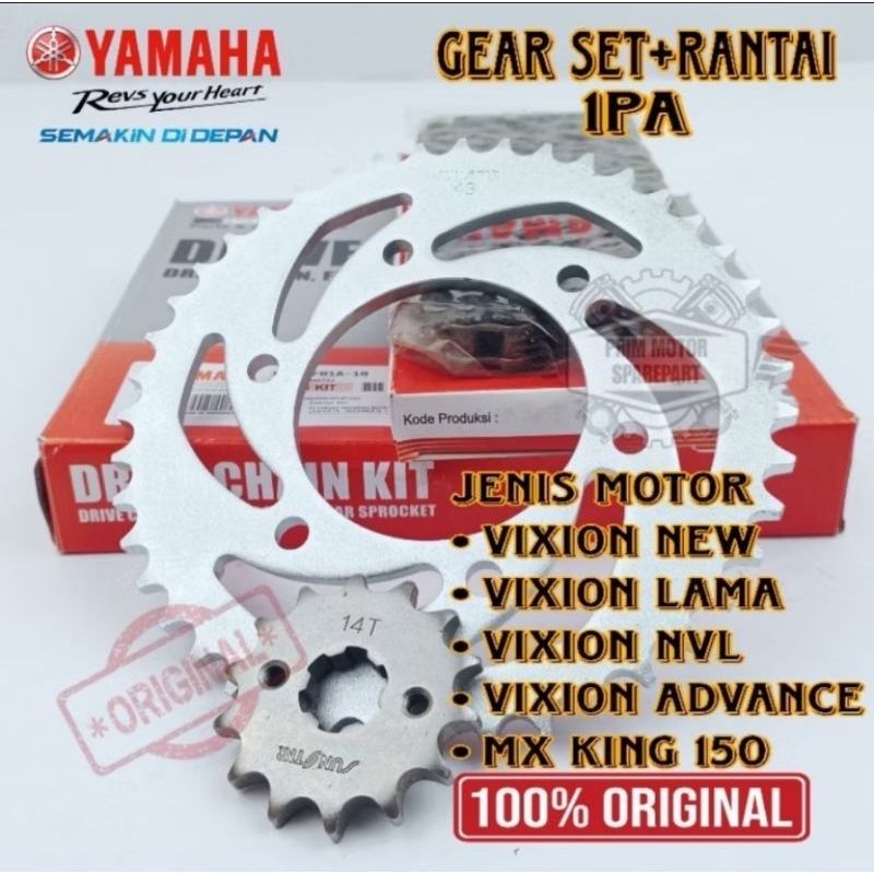 ASLI GEAR SET+RANTAI YAMAHA VIXION NEW/ VIXION NVL/ VIXION ADVANCE/ MX KING 150 KODE-1PA