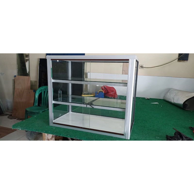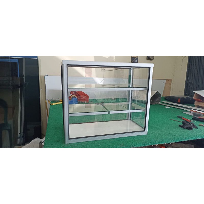 Etalase Kaca Kotak 3 Tingkat 70×35×60 Pintu & Rel Hordeng