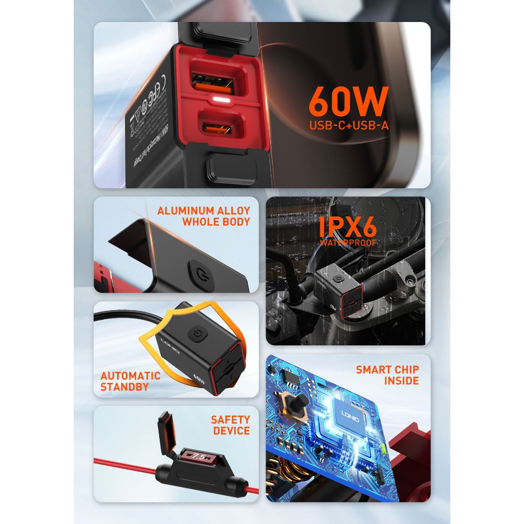 Ldnio C108 60W Fast Charger Pd+Qc3.0 Ipx6 Waterproof Motorcycle Phone Charger