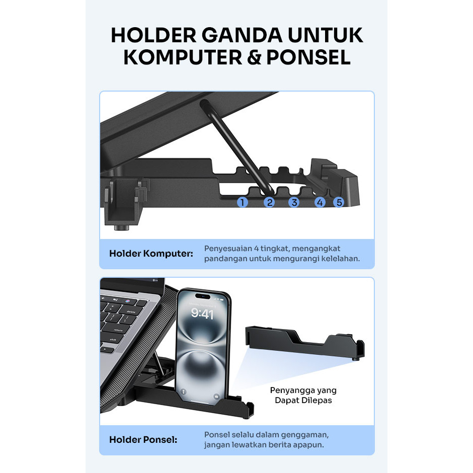 ROBOT RCP10 Alas Pendingin Laptop Cooling Pad 2 Kipas + Phone Holder