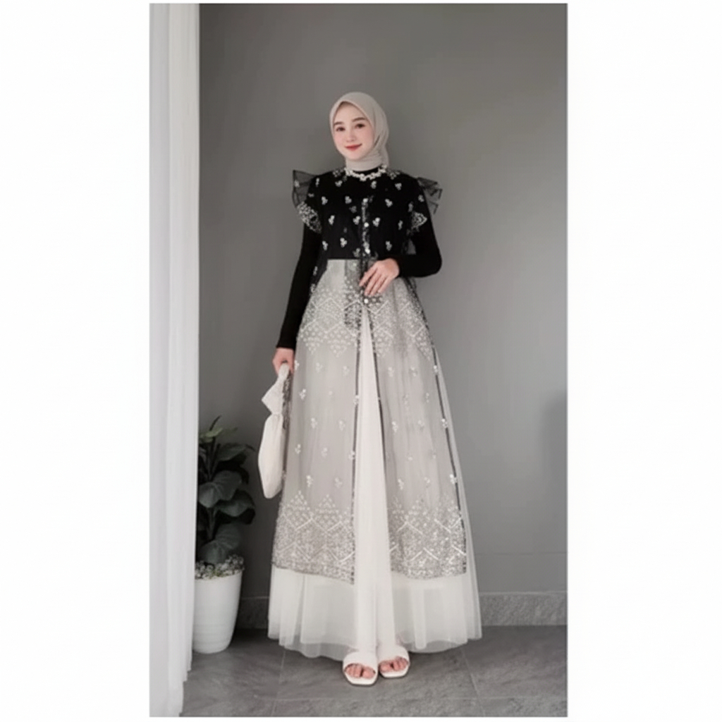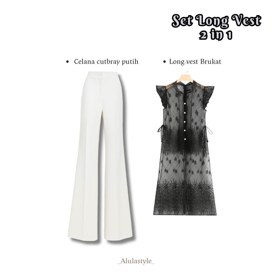 Setelan Vest Long Tunik Brukat + Rok Tutu Putih Ootd Hari Raya Outer Brukat Hitam Style Hijab Wanita
