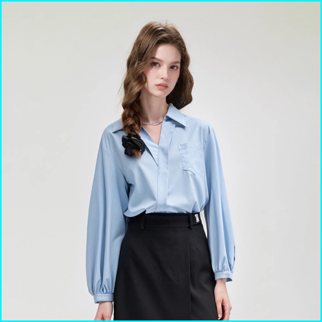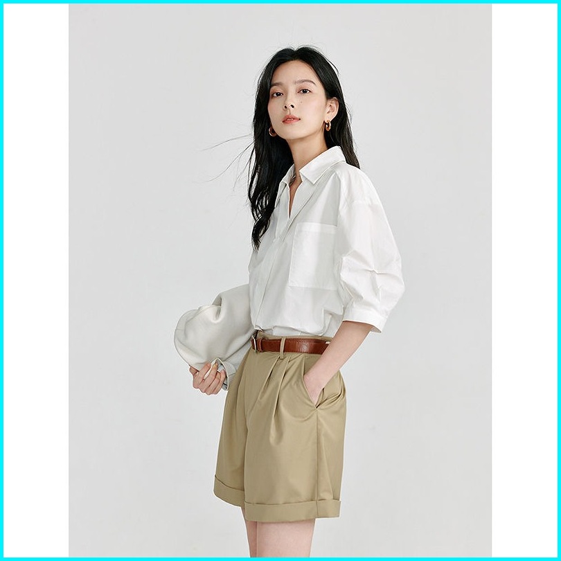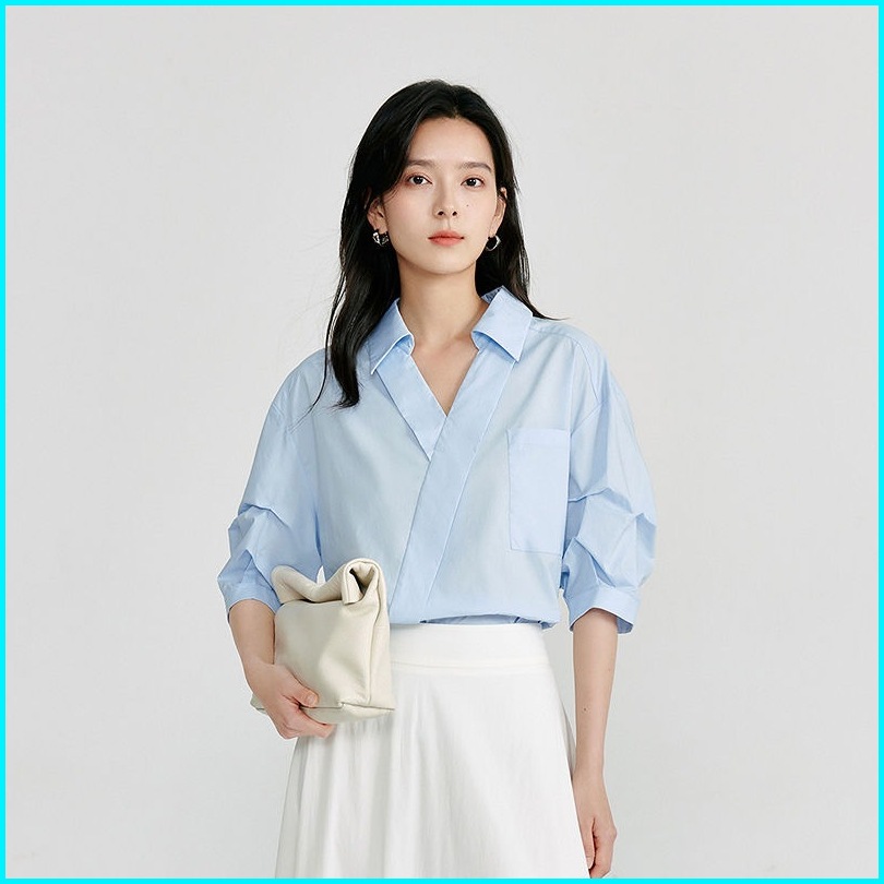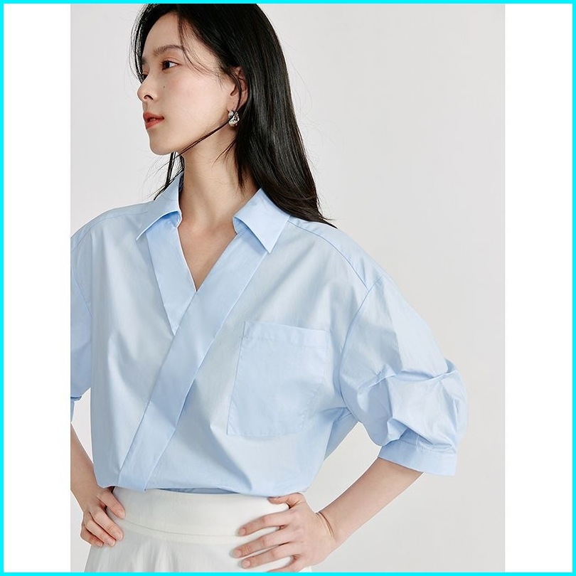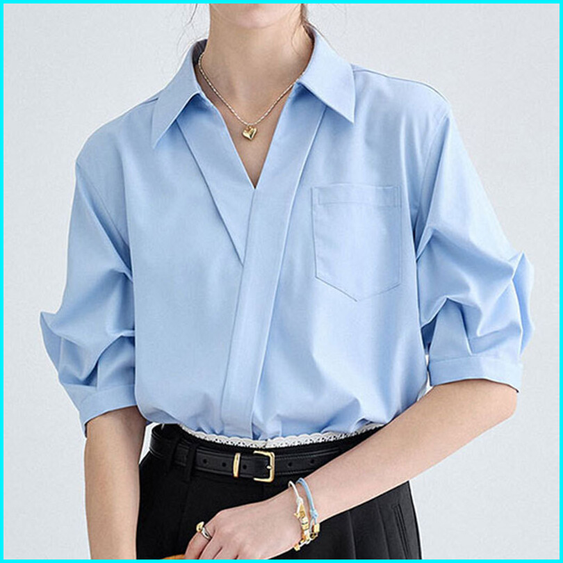 Yuruma Kemeja Lengan Pendek V-neck Gaya Korea Baru Atasan Longgar Lengan Setengah Temperamen Prancis