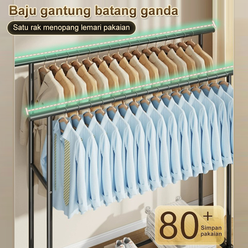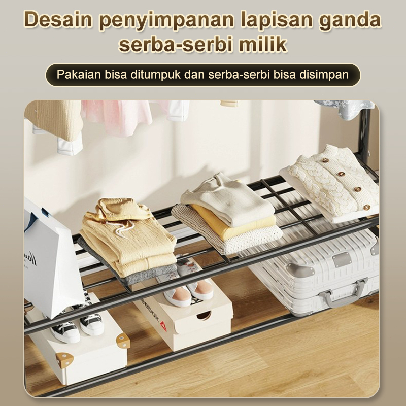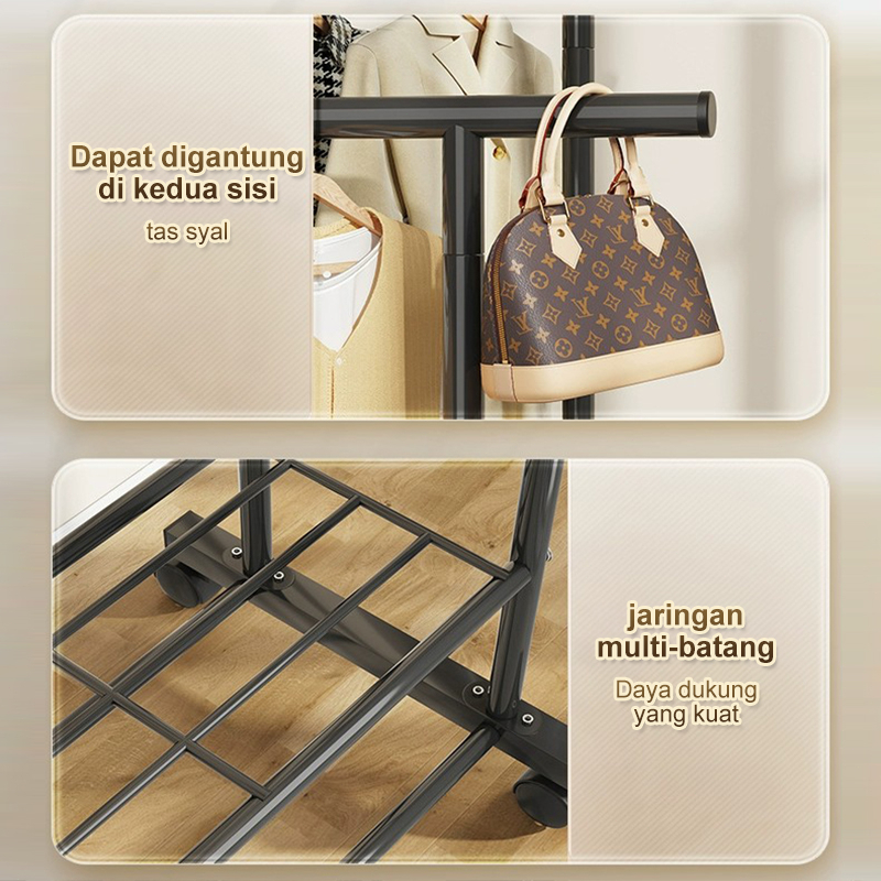 Rak Gantungan Baju Stand Hanger Besi Portable Jemuran Baju Clothes Hanger 2 Susun Dengan 4 Roda