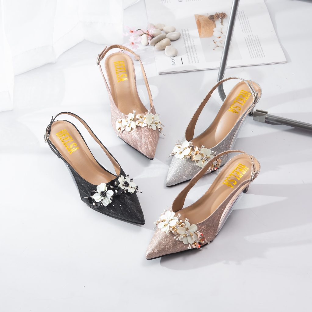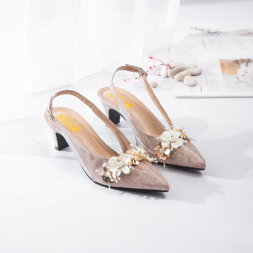 HEELSA Sepatu Mules Pesta Wanita 5cm Sandal Heels Mewah Renda Bunga Mote Sendal Kondangan Terbaru Arsya