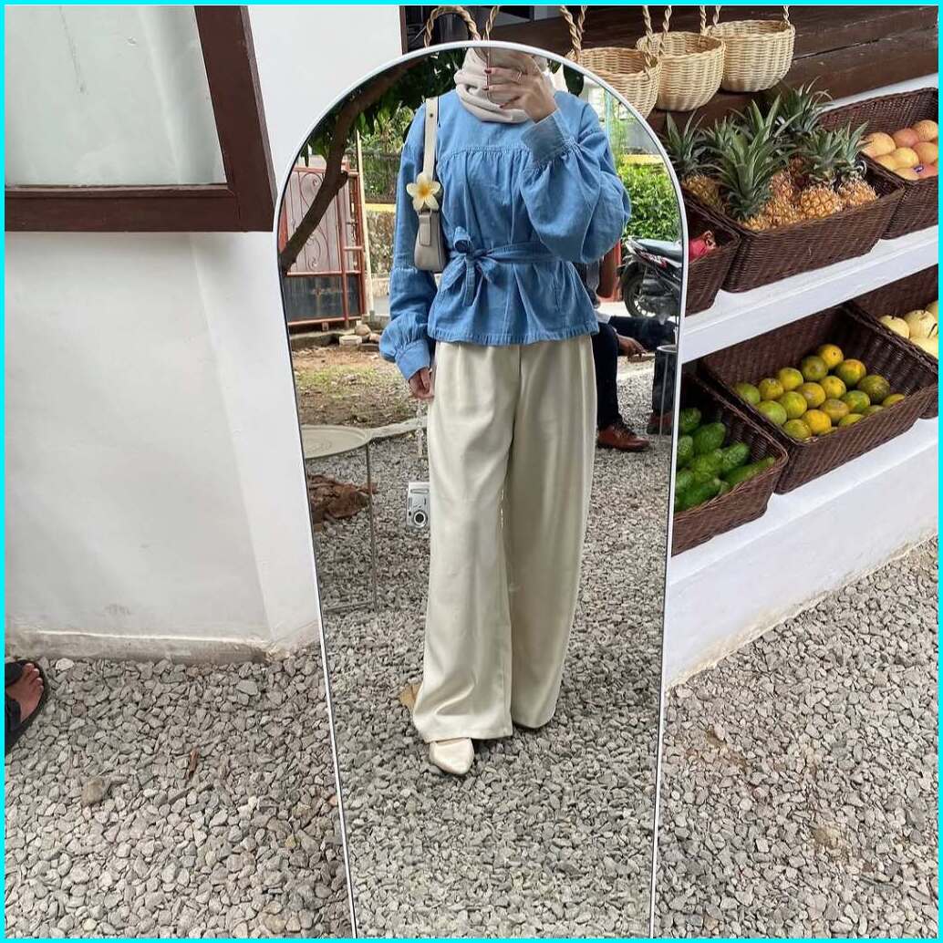 Pola Wear Blouse Denim Wanita Look Korean Style Atasan Jeans Casual Modis Ikat Pinggang Farra