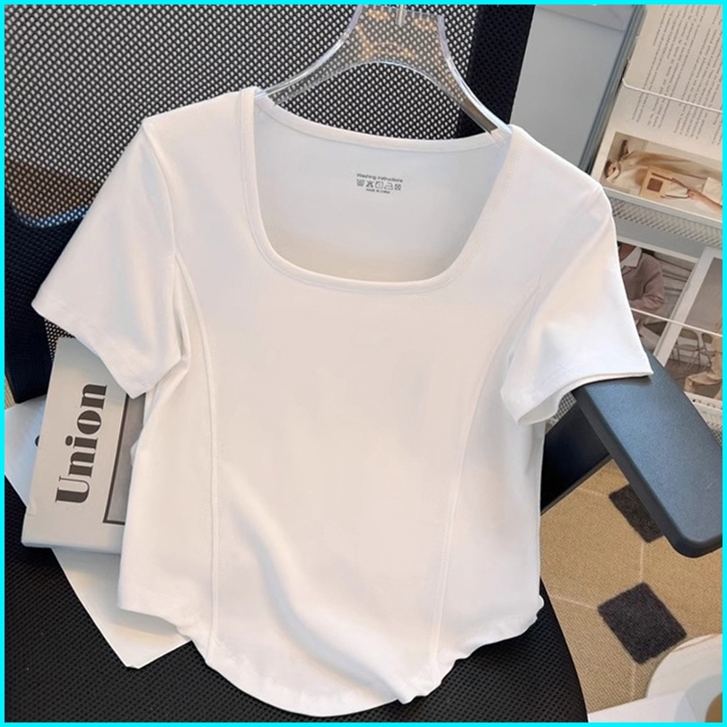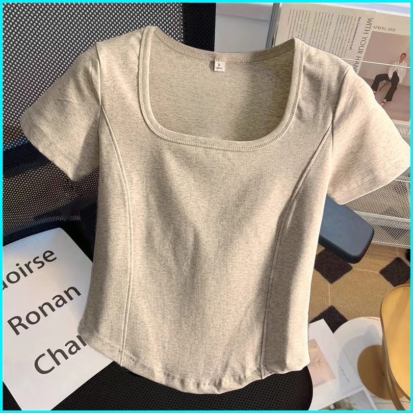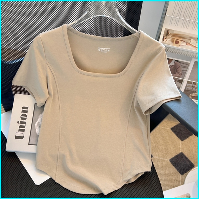 Kaus Pendek Berusuk Kerah Persegi Khaki Baru Atasan Ketat Tidak Beraturan Fashion Wanita Gaya Korea
