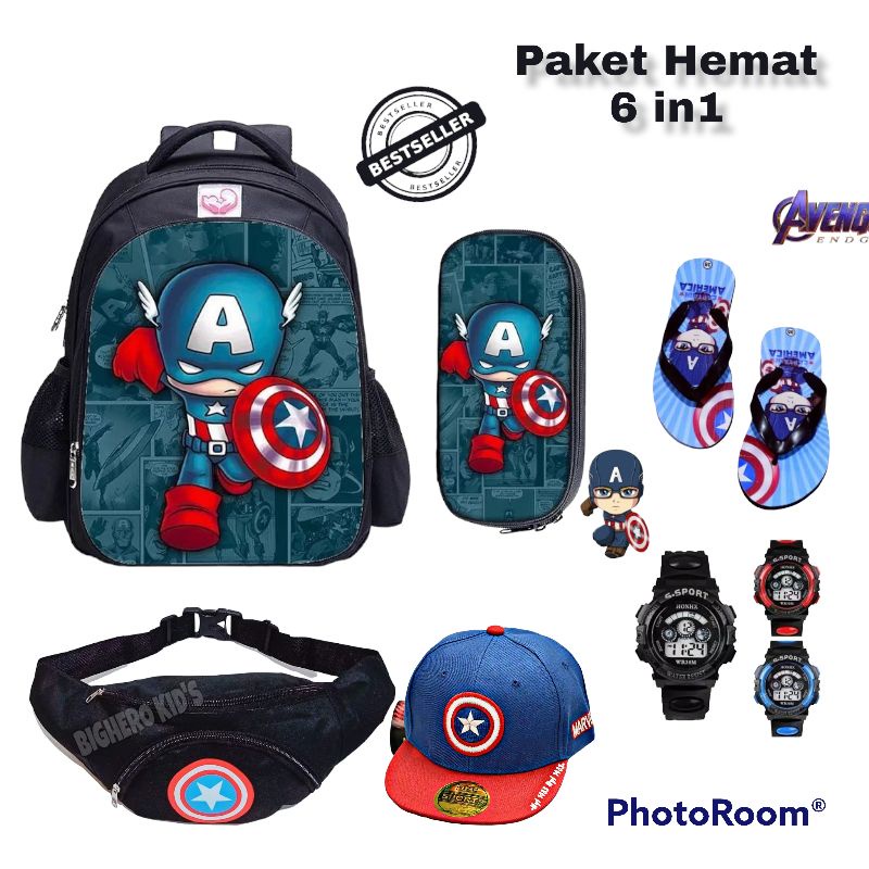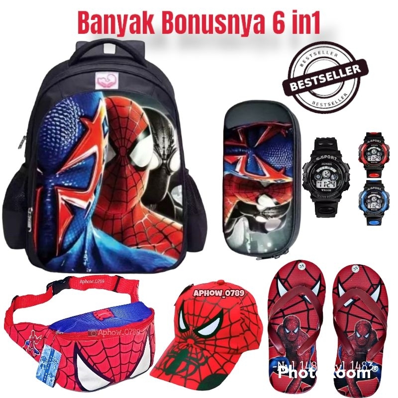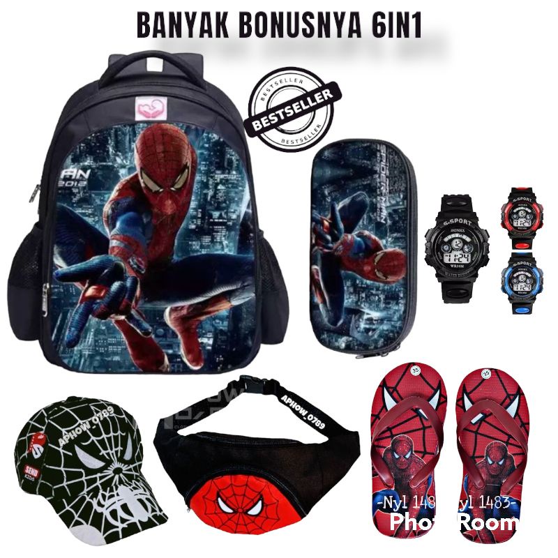 TAS RANSEL PAKET 6IN1 TAS ANAK LAKI-LAKI SEKOLAH TK SD FREE TEMPAT PENSIL TOPI BORDIR TAS WAISTBAG JAM TANGAN DAN SANDAL SPON