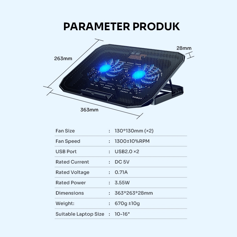 ROBOT Cooling Pad Laptop 10-16 inch Untuk Gaming Kipas 2 Inti Lengkap Dengan Slot HP Tipe Level Fan Speed With Phone Holder Silent Fan RCP10 Original - 1 Tahun