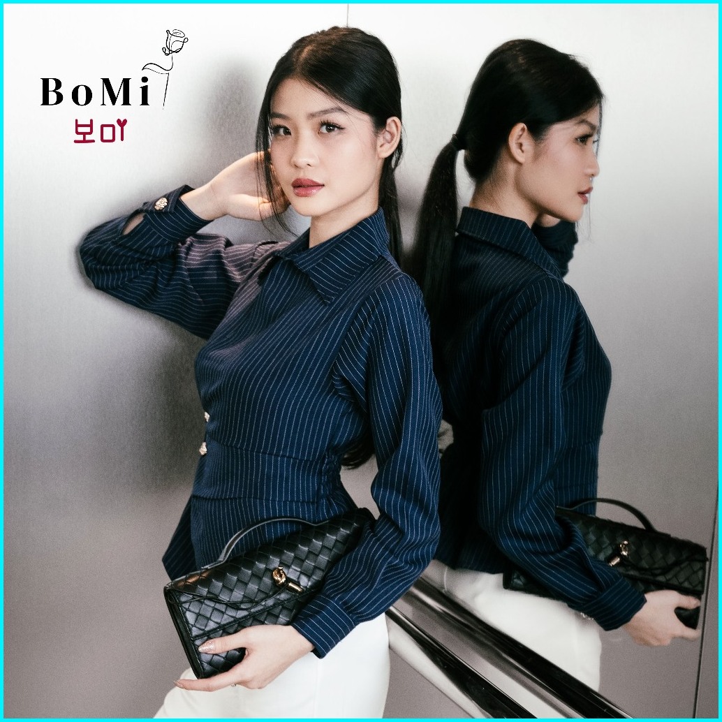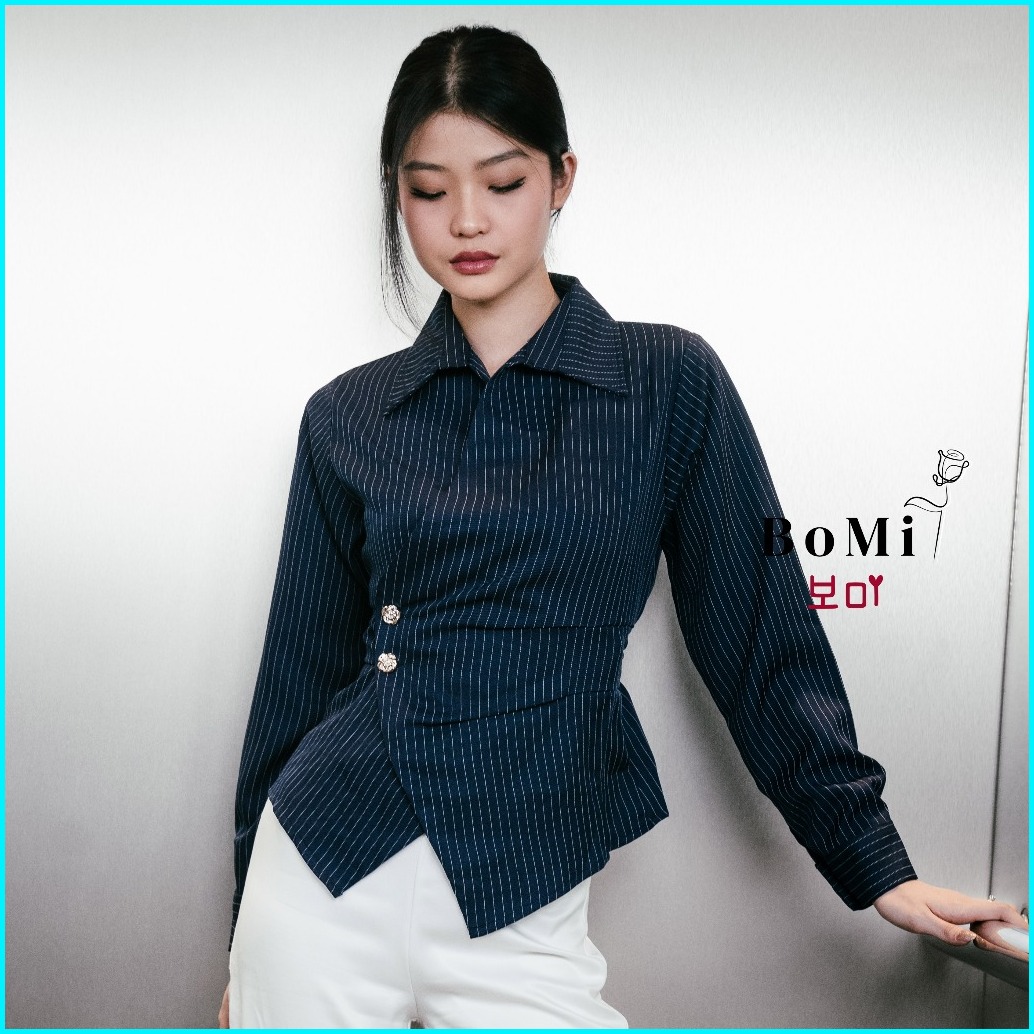 Bomi - Quinn Kemeja Blouse Korean Pocked Fitted Shirt Kemeja Dengan Kantong Salur Garis Nyaman