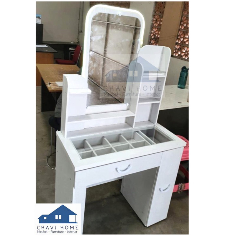 Set Meja Rias Kaca Dengan Lampu Dan Kursi Stool Dengan Laci Sekat Untuk Kosmetik/Makeup/Aksesoris
