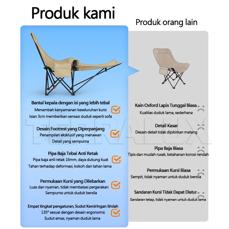 Terralux Kursi Lipat Malas 4 Tingkat Pengaturan Santai Kursi Berkemah Kursi Istirahat Siang Kursi Kuat Dan Tahan Lama Mu