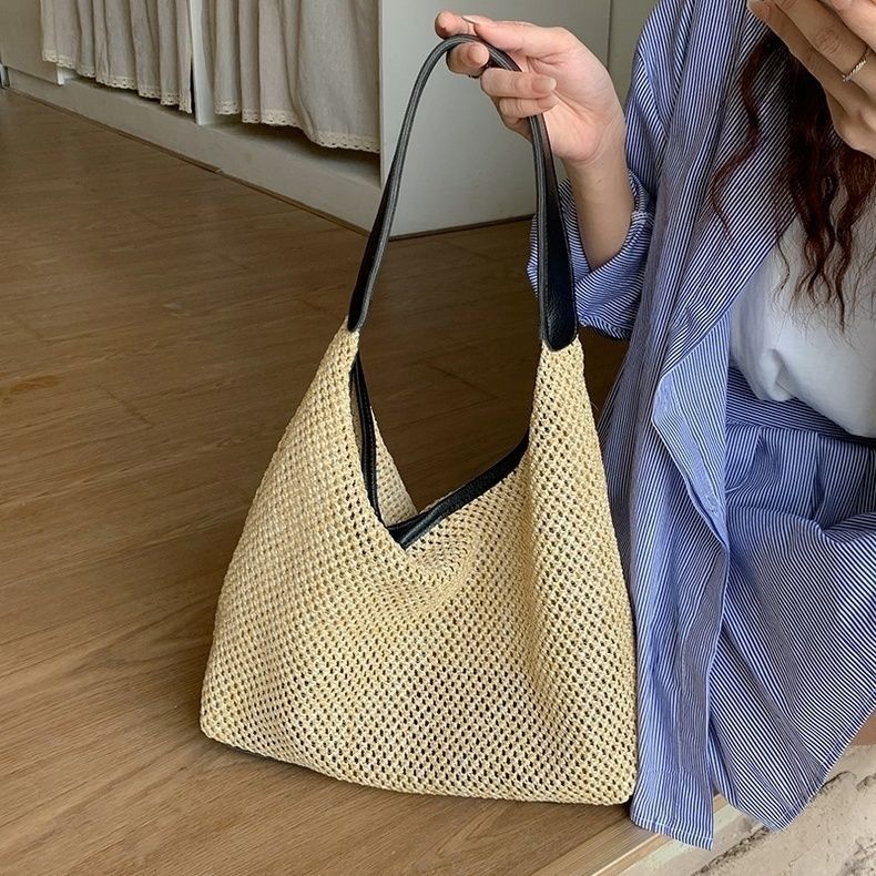 TAS ANYAMAN PANTAI GAYA LIBURAN TAS ANYAMAN BAHU TAS FASHION WANITA TOTE TAS KETIAK JERAMI BERLUBANG TAS BAHU KAPASITAS BESAR