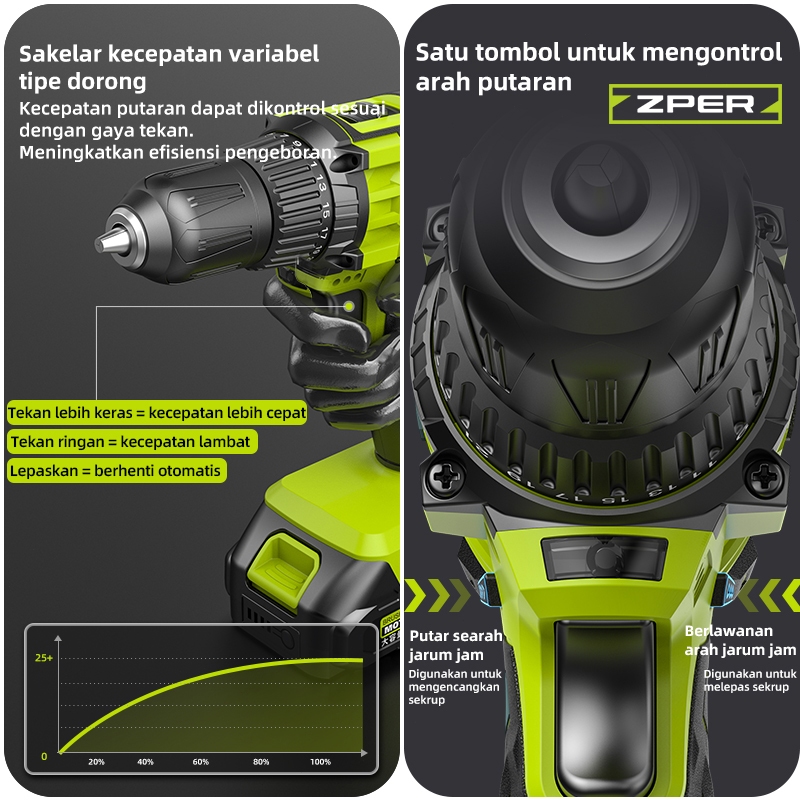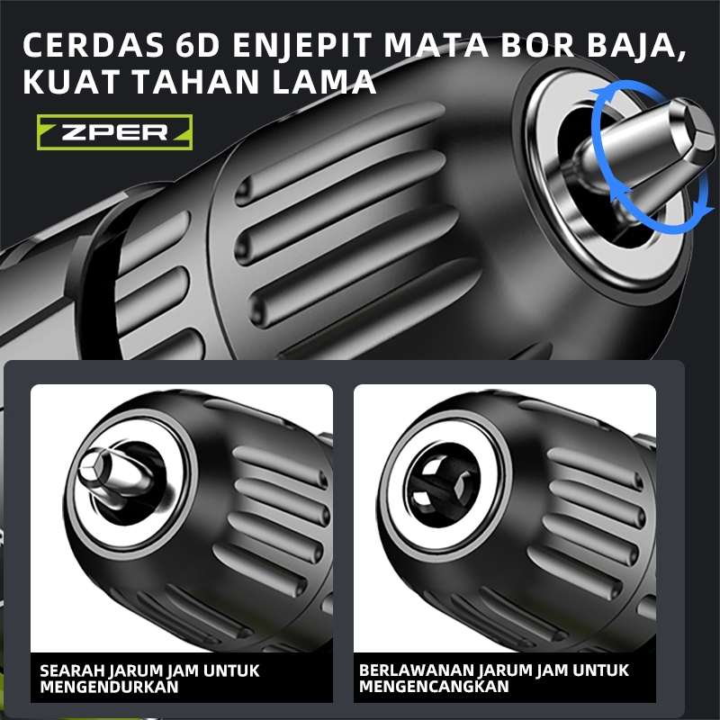 ZPER Bor Cordless 21V Baterai Lithium-ion Tahan Lama Bor Tangan Listrik Multifungsi untuk Kayu Besi Tembok