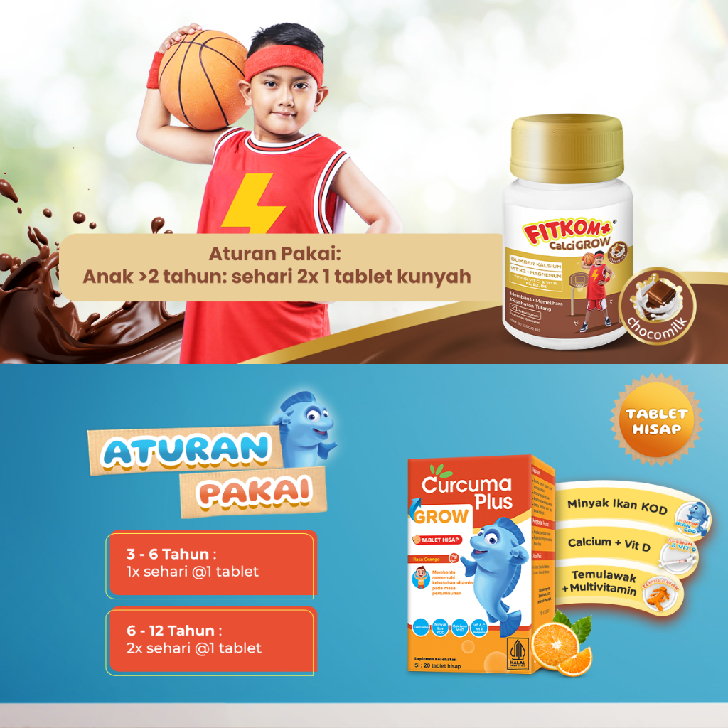 Paket Anak Tumbuh Tinggi Curcuma Plus Grow Tablet 1 Botol & Fitkom Calcigrow 1 Botol